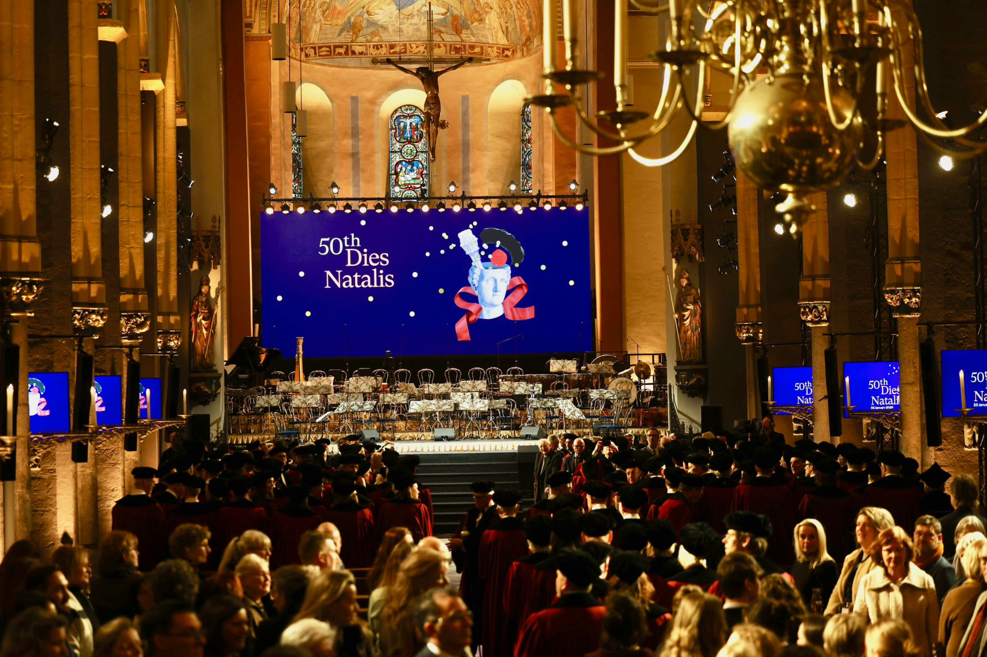 Vandalen bekladden een dag eerder al op zeker tien plekken in de stad gebouwen met hun leuzen. De festiviteiten bij gelegenheid van 50 jaar UM vinden plaats in de Servaasbasiliek. Koning Willem-Alexander is eregast.
