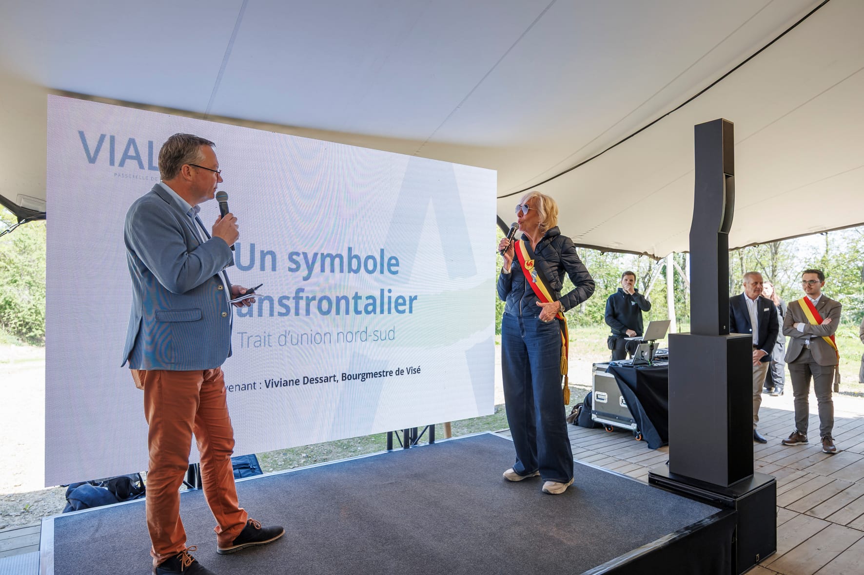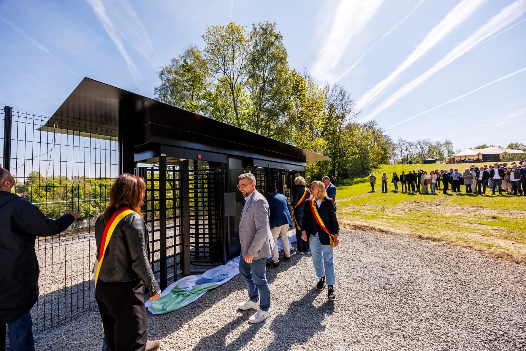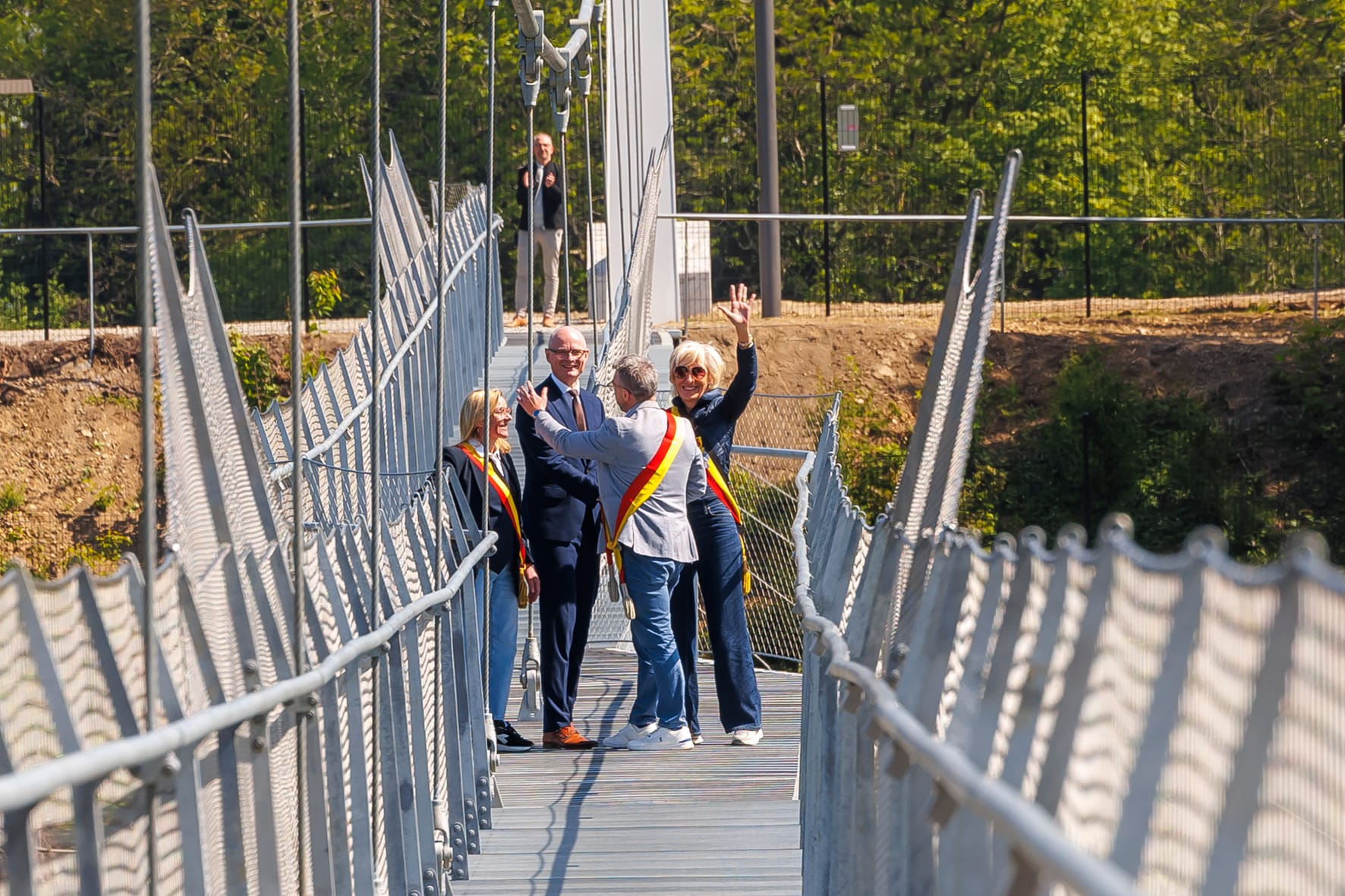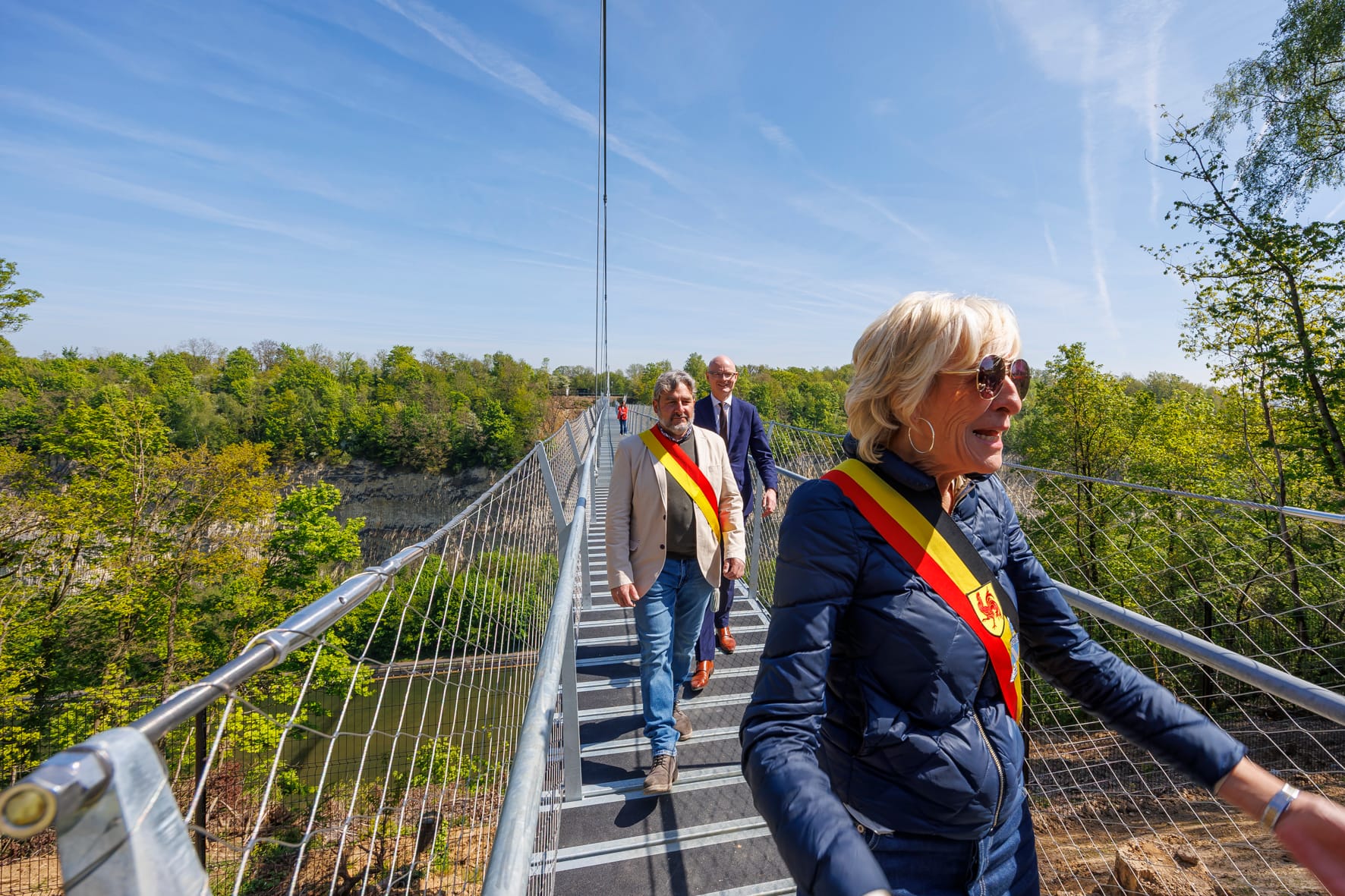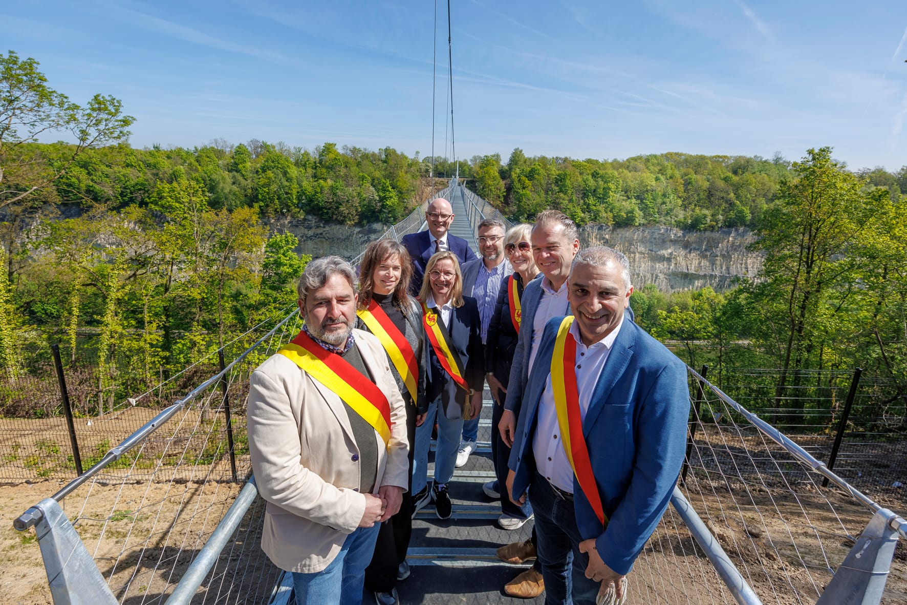 De 200 meter lange hangbrug werd vrijdag officieel geopend door vertegenwoordigers van Waalse en Vlaamse gemeenten en wethouder Hubert Mackus van Maastricht.