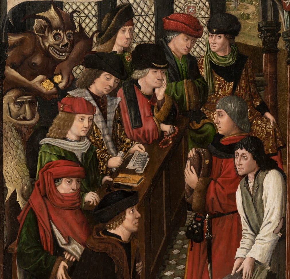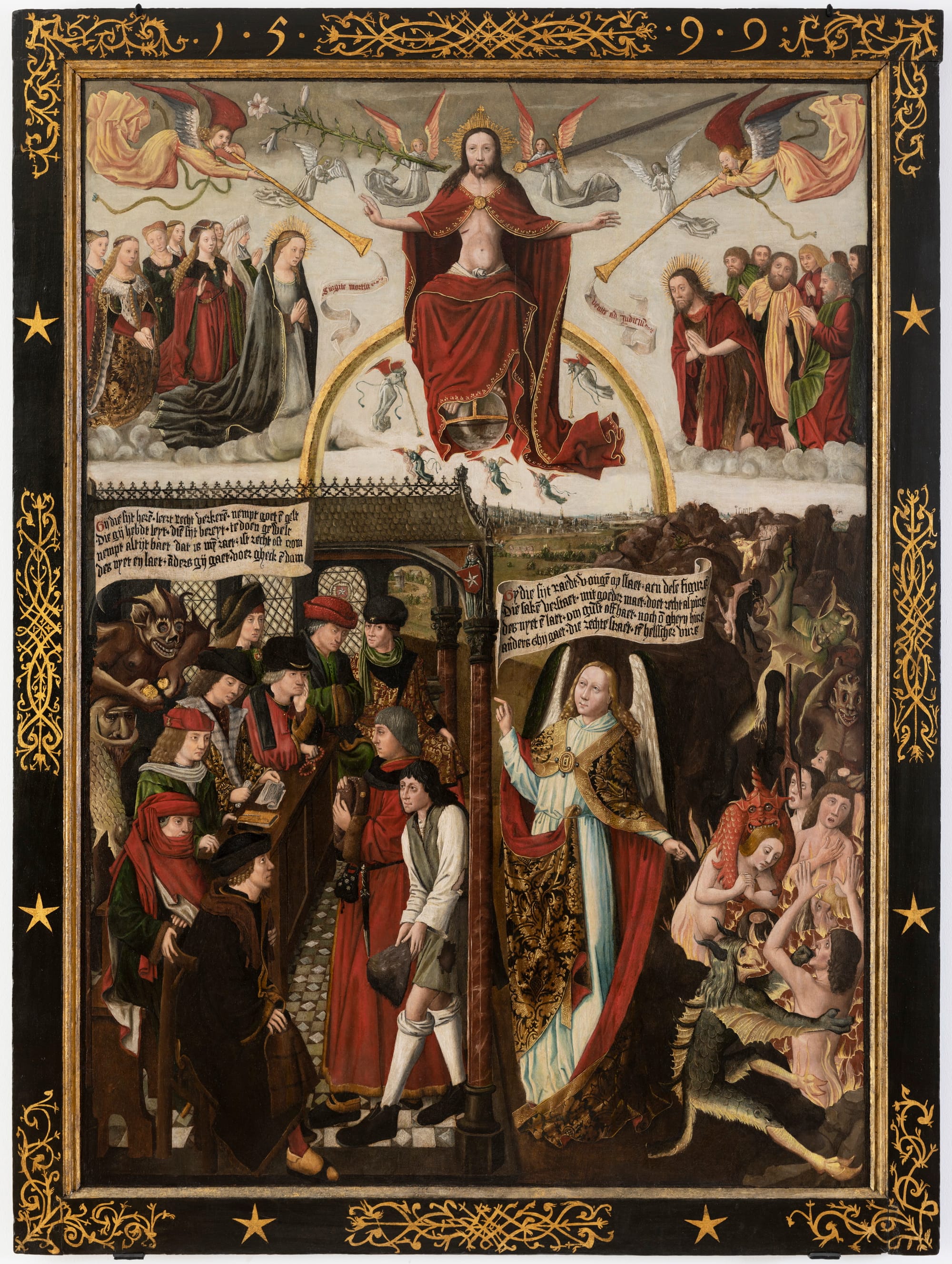 Nadat ik mij eindeloos vergaapt had aan het paneel, bleef de voorstelling in mijn hoofd hangen. Bij thuiskomst besloot ik mij verder te verdiepen in de achtergrond van dit bijzondere werk, dat eigendom is van de Gemeente Maastricht. Op de website van het Maastricht Museum las ik dat het paneel vanaf dinsdag 10 februari aanstaande daar te bewonderen zal zijn. Volgens het Maastricht Museum is het “een meesterwerk vol symboliek over werk en macht in Maastricht”. Verder meldt het Maastricht Museum: “Bovenaan zie je het Laatste Oordeel: Christus als rechter op een gouden regenboog, omringd door engelen die de doden wekken. Daaronder een rechtszitting: een rijke en een arme man staan tegenover elkaar, terwijl een duivel de rechters probeert om te kopen. De aartsengel Michaël wijst streng naar de hel - een duidelijke waarschuwing voor wie zich laat verleiden.”