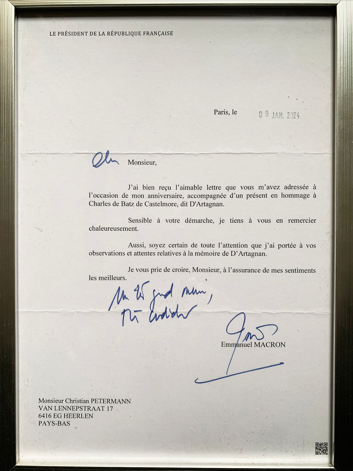 In de bijlage de opgetekende tijdlijn van het echte verhaal omtrent de (mogelijke) ontdekking van het Graf van D'Artagnan met o.a. de foto die Macron heeft gekregen, de eerste brief van Macron en het biljet + docu die de aanleiding vormde voor mijn nieuwsgierigheid.