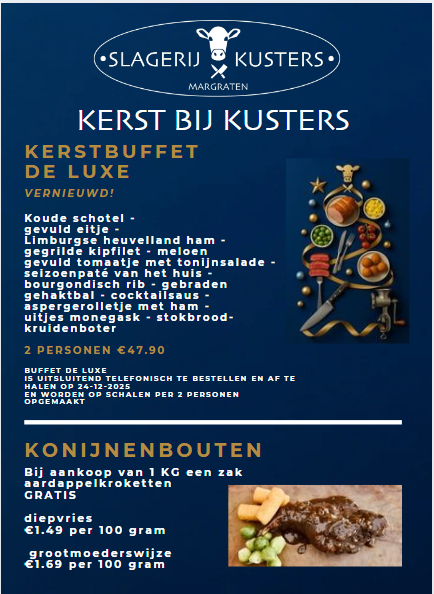 Onze heerlijke lekkernijen zijn weer te bestellen.. konijnenbouten op grootmoederswijze met gratis aardappelkroketten, rollades, gourmetschalen en ons heerlijk vernieuwd “kerstbuffet de luxe”