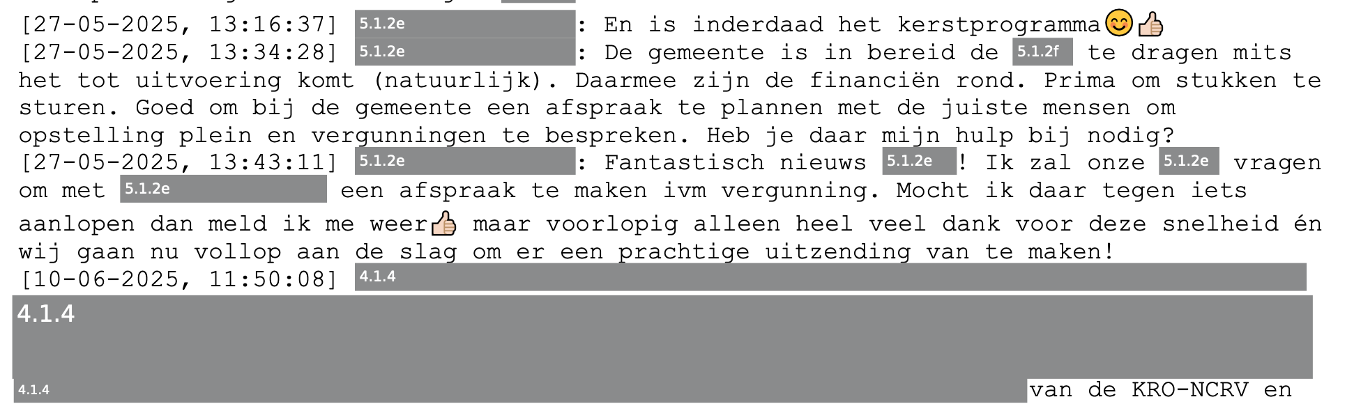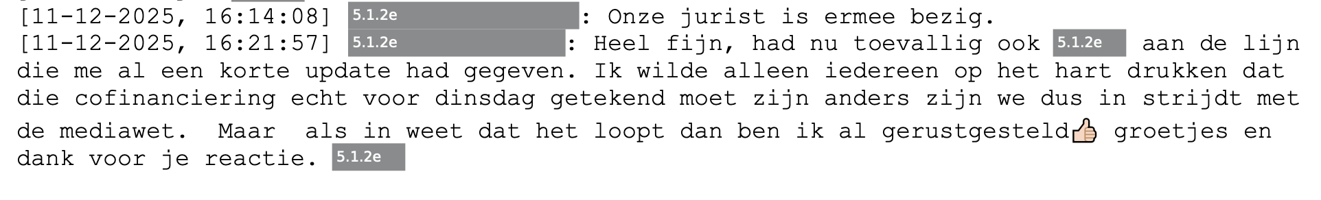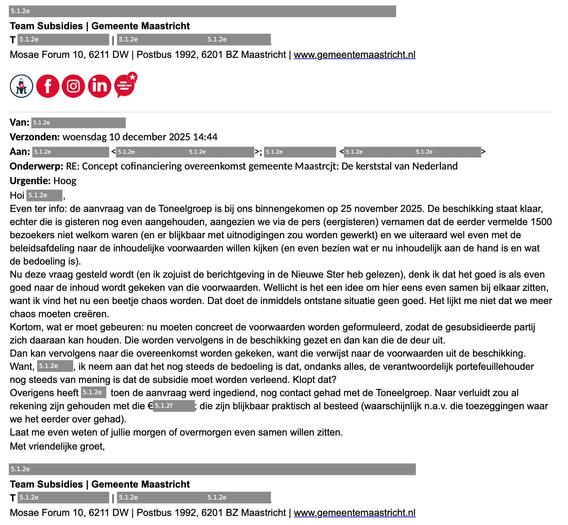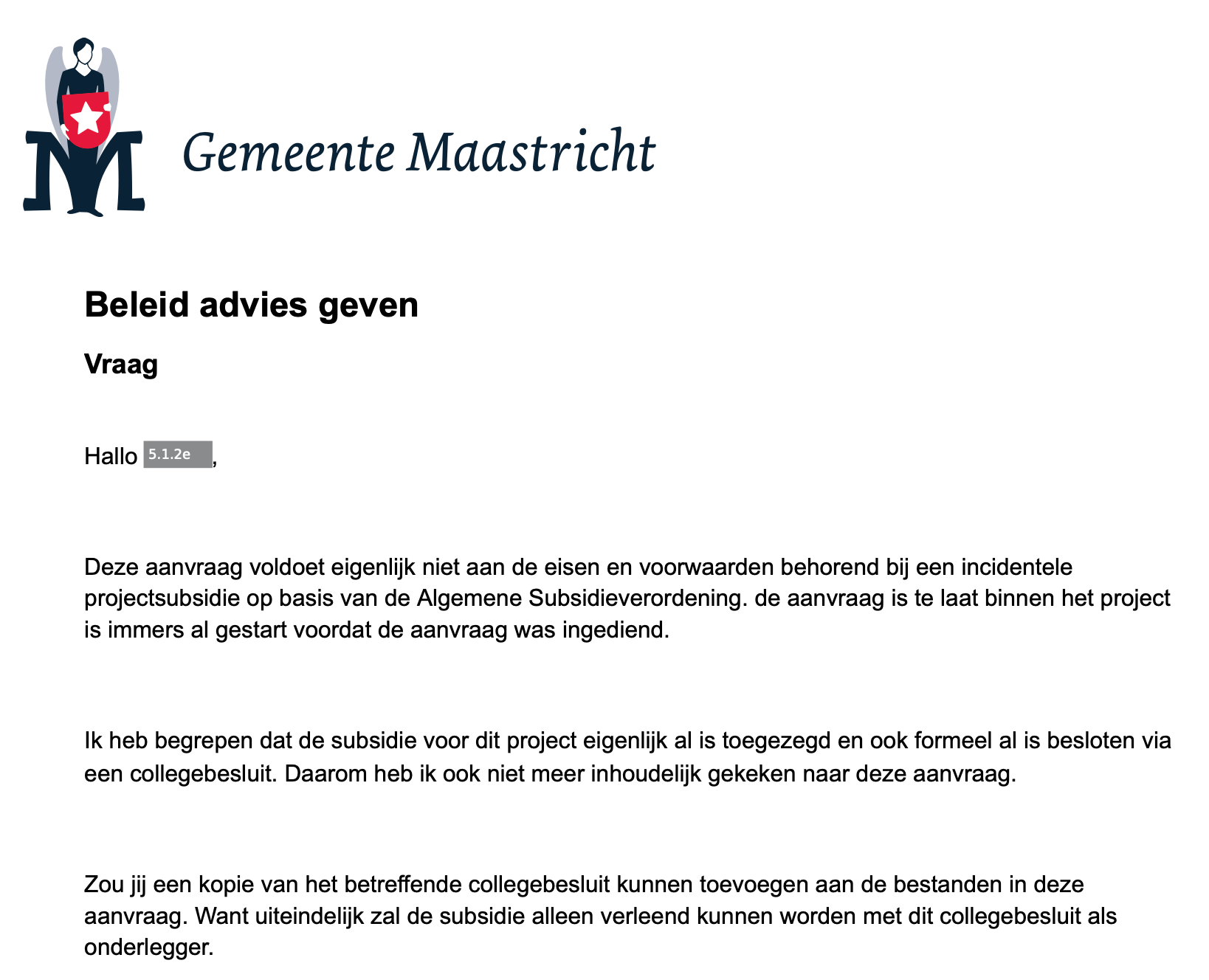 Op het moment in mei 2025 dat bovenstaande chat werd gewisseld, was er nog geen formele subsidie-aanvraag ingediend. Die zou pas helemaal aan het eind van het jaar volgen. Op dat moment in mei had het Team Subsidies nog geen advies uitgebracht. Ze hadden toen waarschijnlijk niet eens gehoord van de plannen.