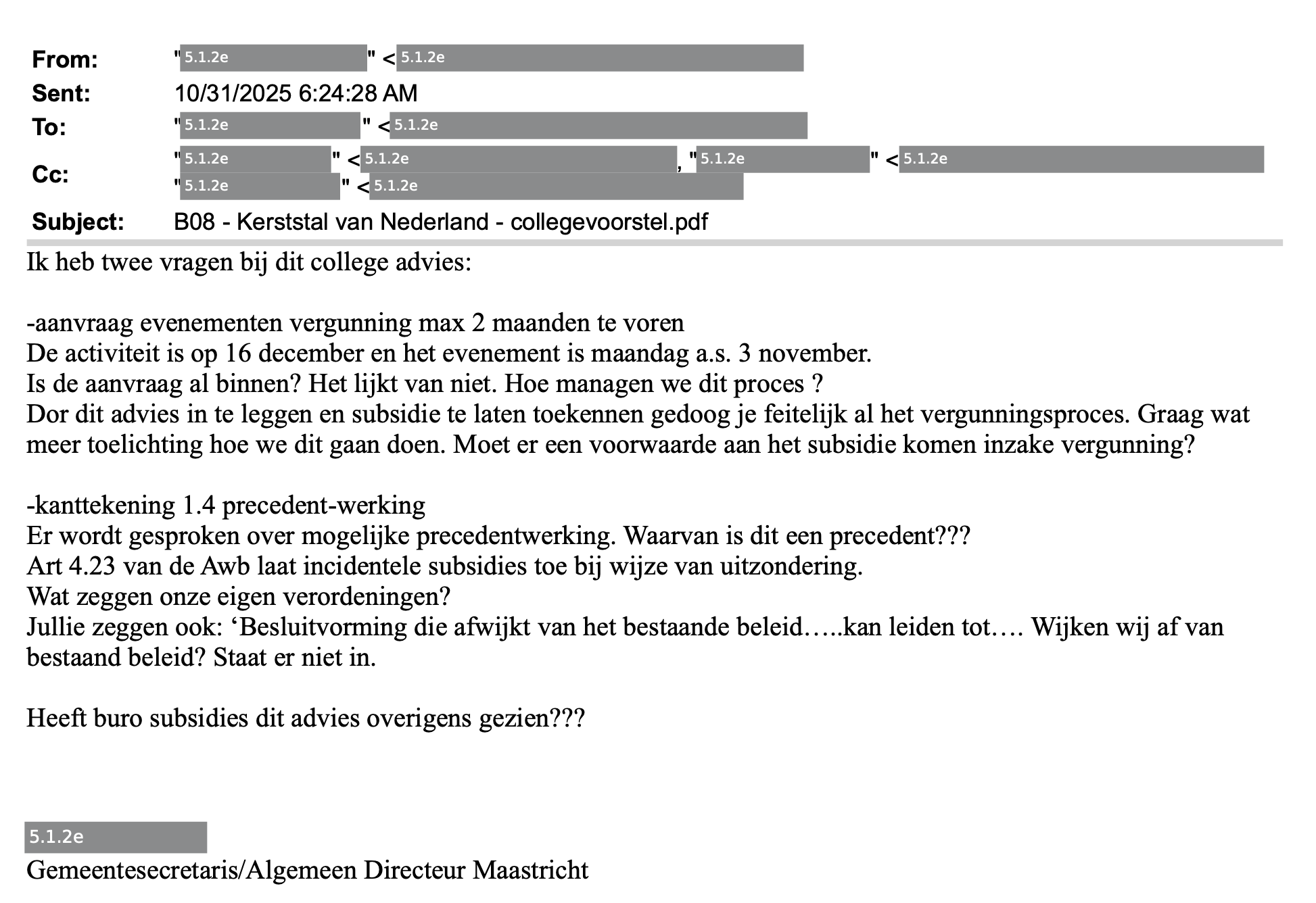 Het Team Subsidies was in de aanloop naar de subsidiebeschikking niet de enige afdeling binnen de gemeente met nog veel vragen. Ook de gemeentesecretaris kwam bijna vraagtekens tekort op zijn toetsenbord. In twee alinea's stelt hij acht vragen.