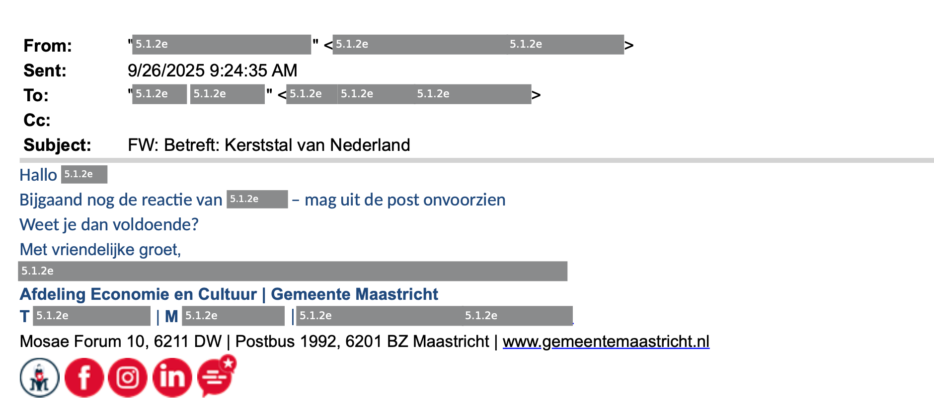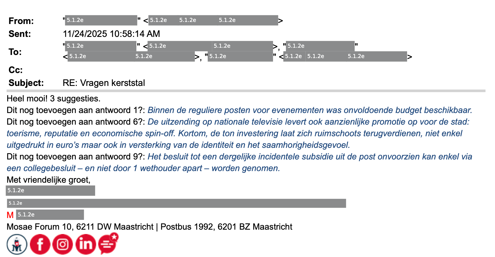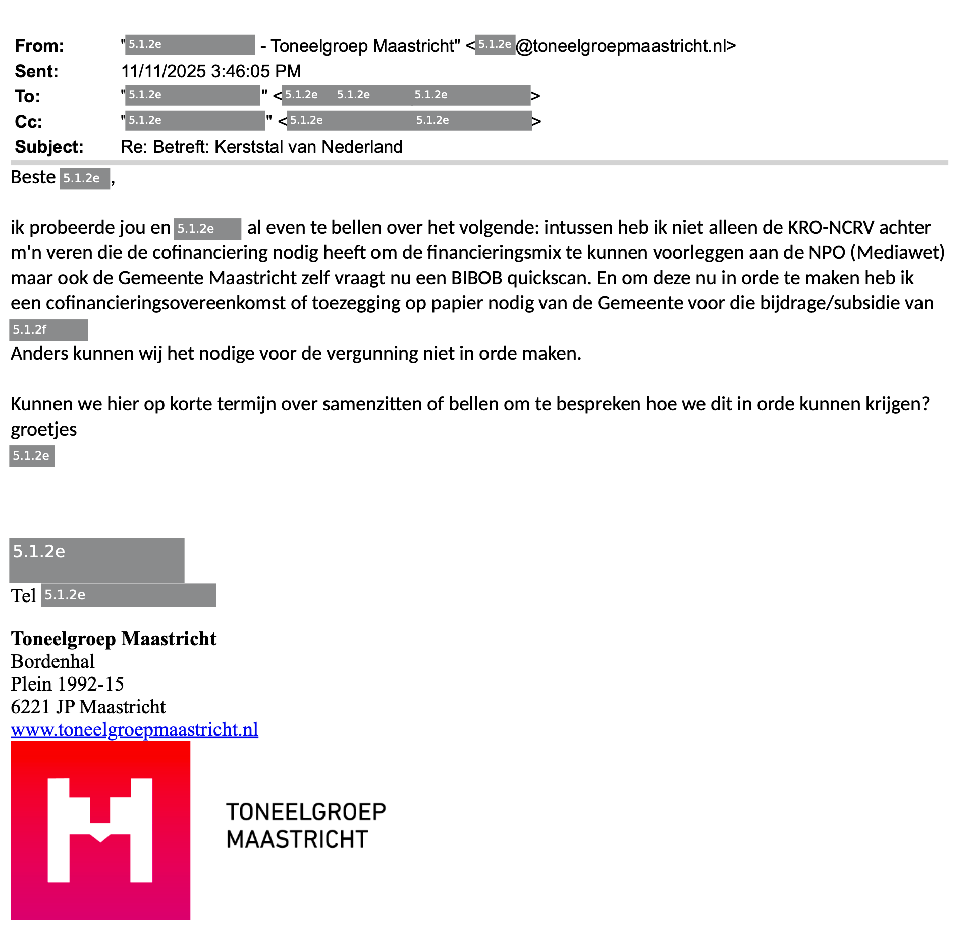 De beslissing om een bijdrage te leveren aan De Kerststal was een collegiale afweging van het college. De vraag van Toneelgroep Maastricht is in het voorjaar bij mij binnengekomen en door mij in het college besproken. Het college heeft toen uitgesproken dit initiatief inhoudelijk te willen ondersteunen. Dat is geen individuele toezegging geweest, maar een bestuurlijke keuze van het college als geheel.