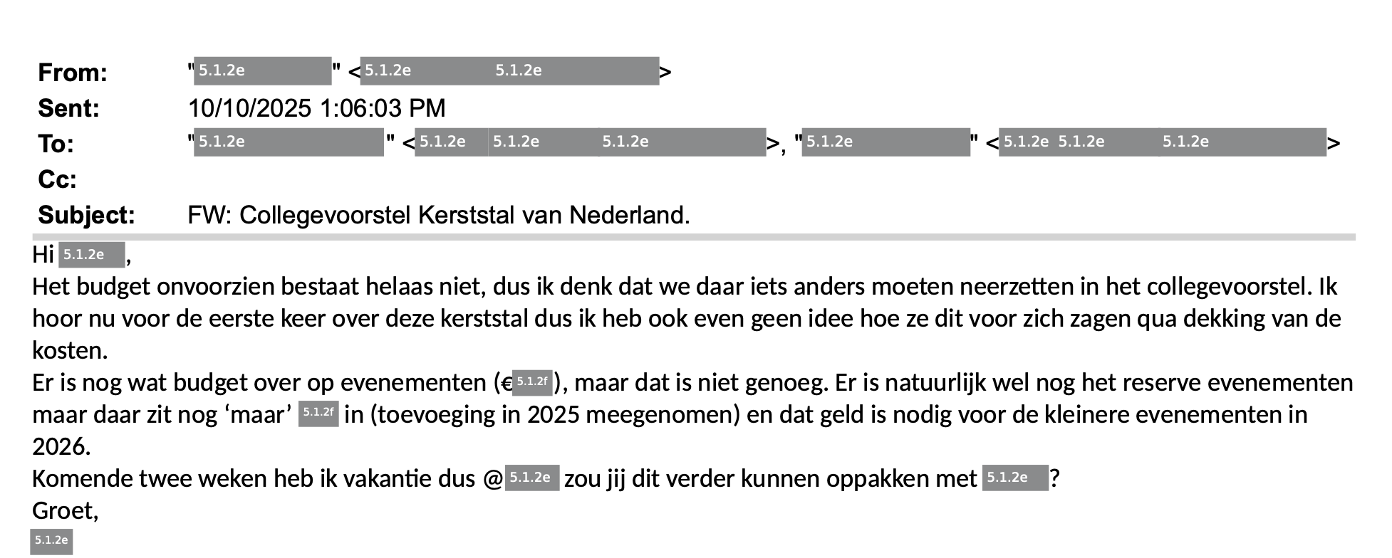 De vergelijking met de Nederlandse Dansdagen begrijp ik, maar het betreft een andere situatie. Bij de NDD ging het om het verschuiven van middelen binnen een bestaand begrotingsdeelgebied, wat politiek veel discussie opriep. Bij de Kerststal ging het om een externe, incidentele subsidieaanvraag. Er is geen bestaand structureel budget verschoven of verdrongen, maar een afzonderlijke aanvraag beoordeeld en toegekend binnen de bevoegdheid van het college. Dat is bestuurlijk en financieel een andere situatie dan bij de NDD. Dat onderscheid is ook in de beantwoording van de schriftelijke vragen toegelicht. Dat neemt niet weg dat de gevoeligheid rond eerdere discussies maakt dat dit besluit extra kritisch wordt bekeken – en dat is op zichzelf terecht.