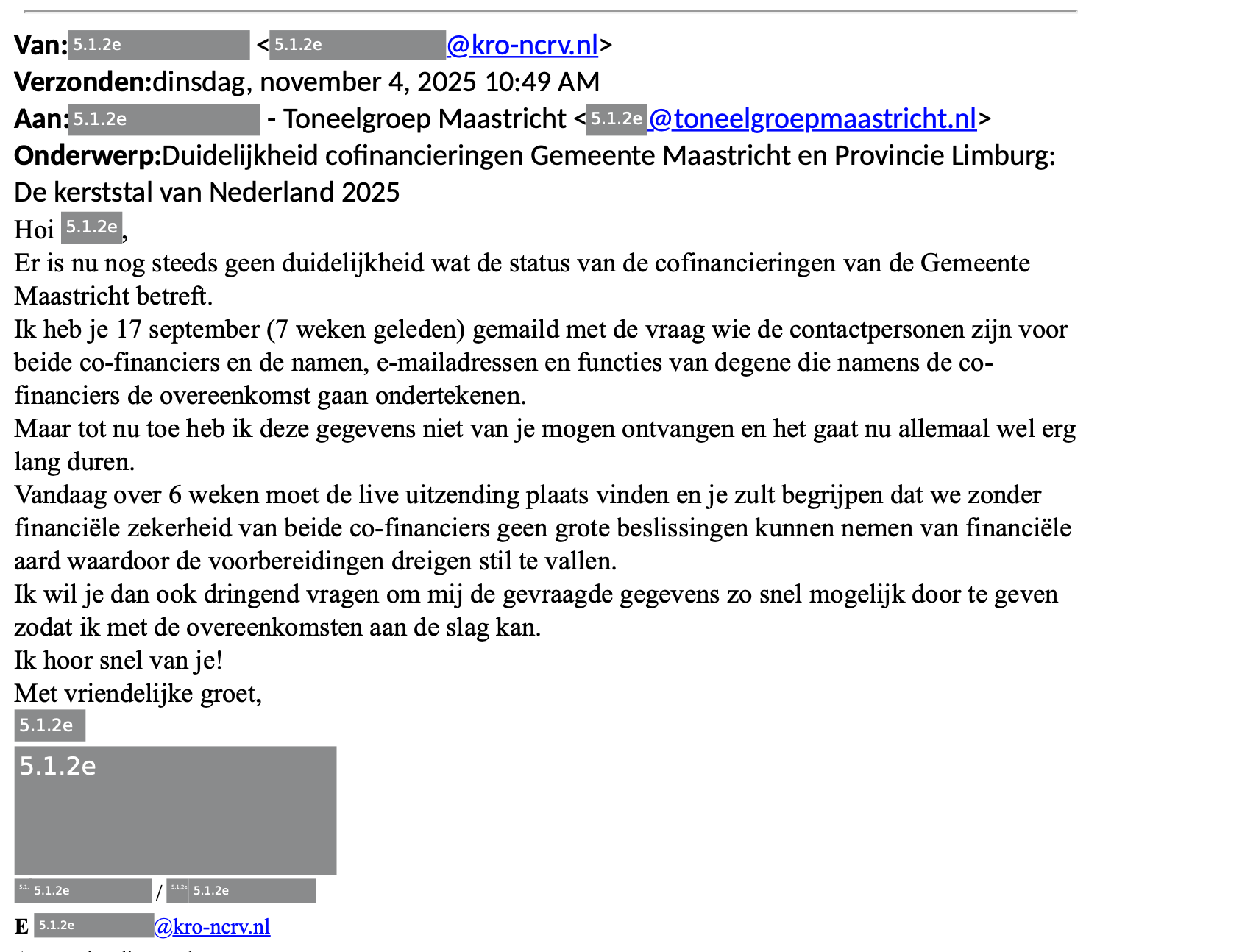 De aanvraag zelf laat overigens nog langer lang op zich wachten. Zo lang, dat ze ook aan de zijde van KRO/NCRV, ongeduldig en een tikkeltje nerveus worden, zo blijkt uit een mail aan de Toneelgroep Maastricht. "Vandaag over zes weken moet de live uitzending plaats vinden en je zult begrijpen dat we zonder financiële zekerheid van beide co-financiers geen grote beslissingen kunnen nemen van financiële aard, waardoor de voorbereidingen stil dreigen te vallen."