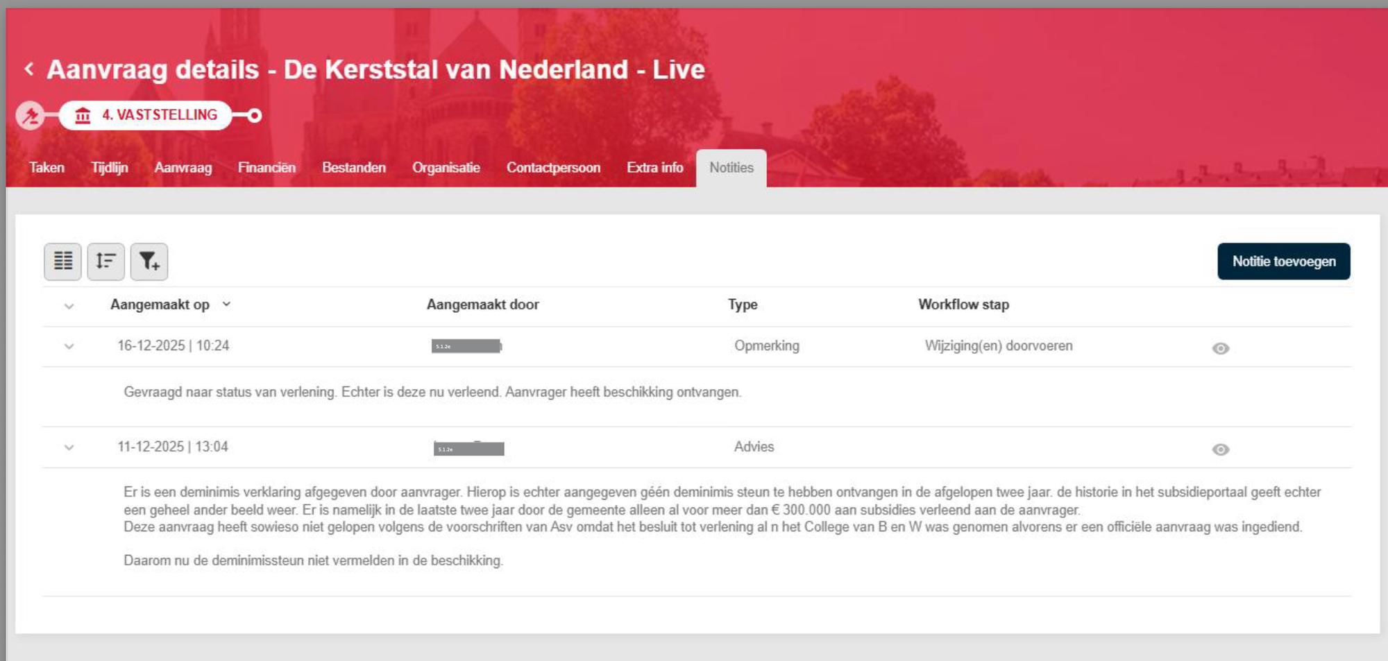 "Er is een de-minimsverklaring afgegeven door de aanvrager. Hierop is echter aangegeven géén deminimis steun te hebben ontvangen in de afgelopen twee jaar: de historie in het subsidieportaal geeft echter een geheel ander beeld weer. Er is namelijk in de laatste twee jaar door de gemeente alleen al voor meer dan 300.000 euro subsidie verleend aan de aanvrager. Deze aanvraag heeft sowieso niet gelopen volgens de voorschriften van de Algemene Subsidie Verordening omdat het besluit tot verlening in het College van B en W was genomen alvorens er een officiële aanvraag was ingediend. Daarom deze de-minimissteun niet vermelden in de beschikking."