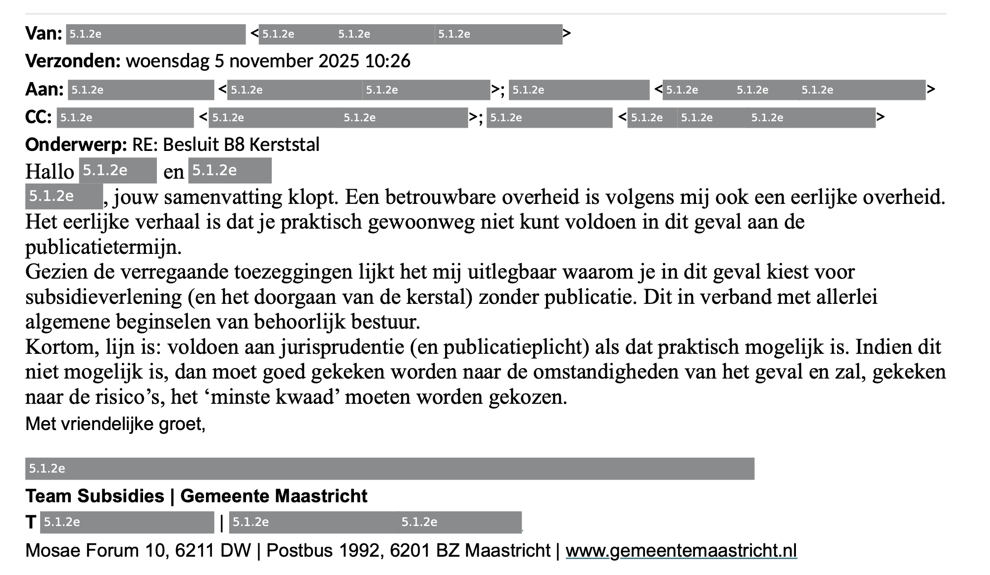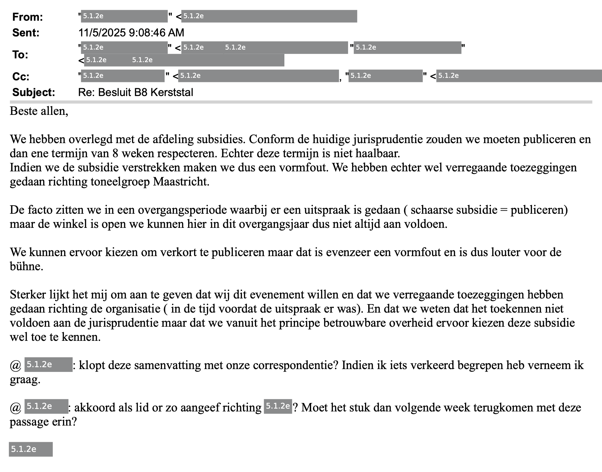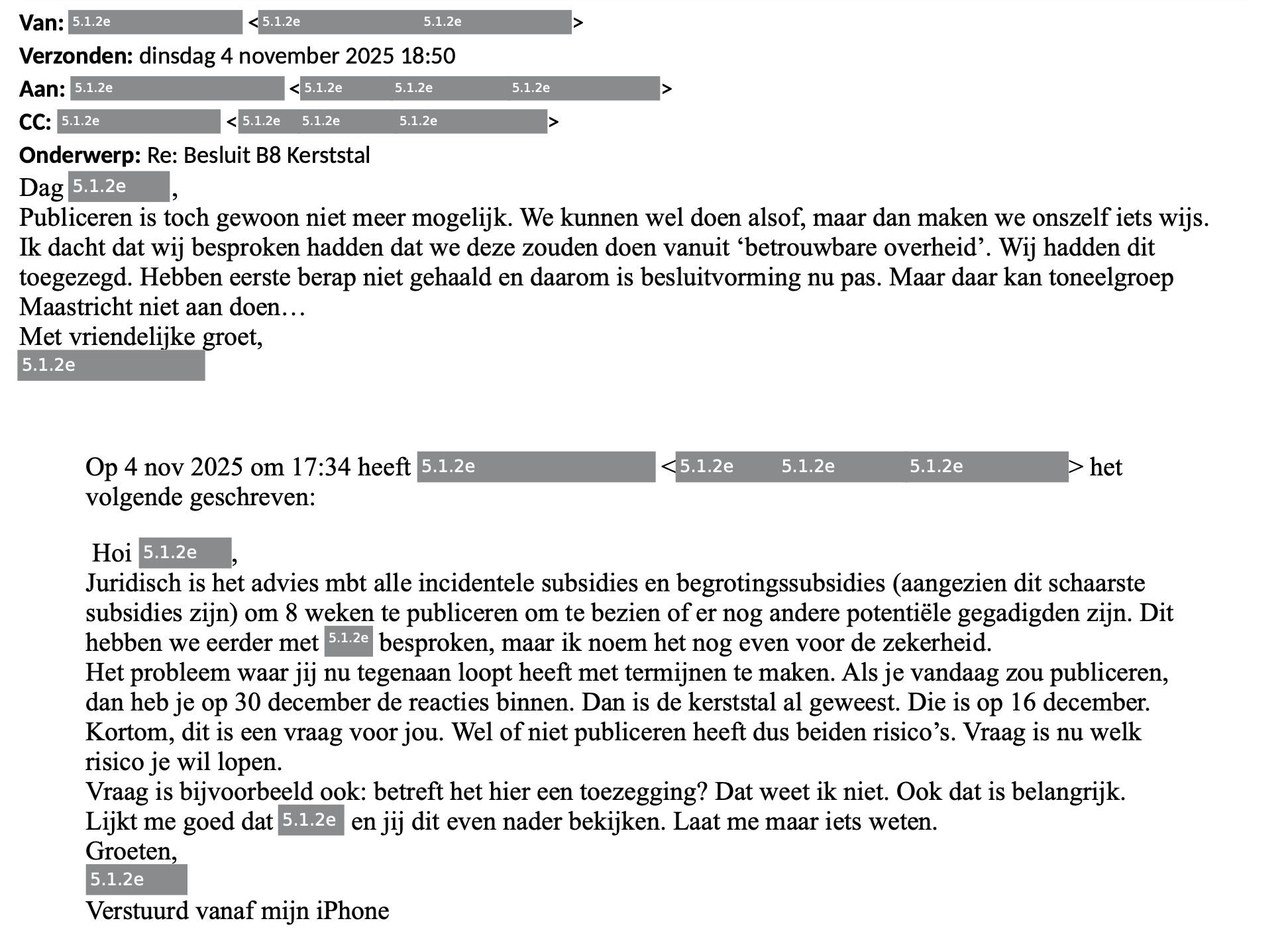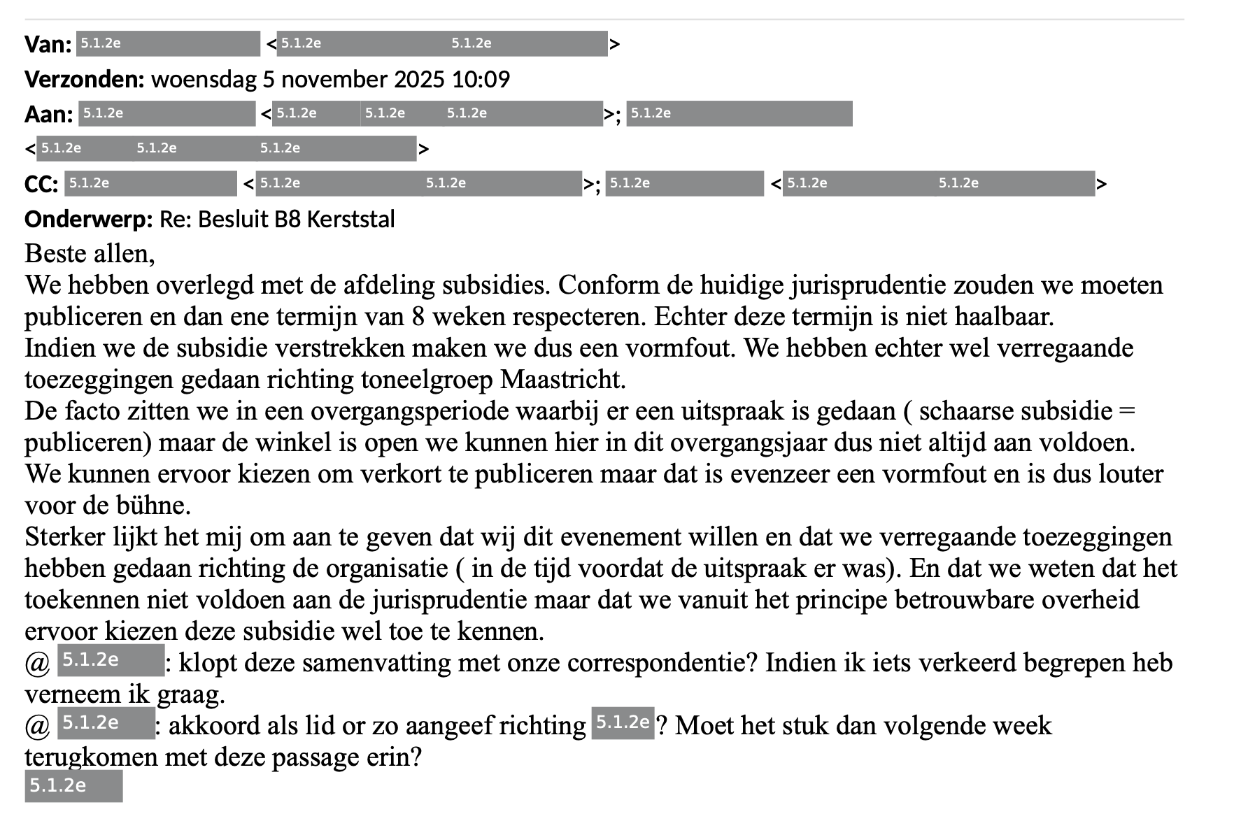 Het is een lijn die een kwartier later ook gevolgd wordt door het Team Subsidies. "Gezien de verregaande toezeggingen lijkt het mij uitlegbaar waarom je in dit geval kiest voor subsidieverlening (en het doorgaan van de kerststal) zonder publicatie."