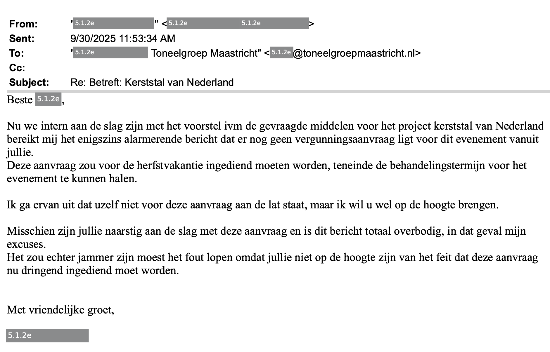 Terwijl de ambtenaren nadenken hoe de subsidie te verantwoorden, ligt er eind september overigens nog steeds geen aanvraag van de Toneelgroep Maastricht. Een ambtenaar: "Nu we intern aan de slag zijn met het voorstel ivm de gevraagde middelen voor het project kerststal van Nederland bereikt mij het enigszins alarmerende bericht dat er nog geen vergunningsaanvraag ligt voor dit evenement vanuit jullie."