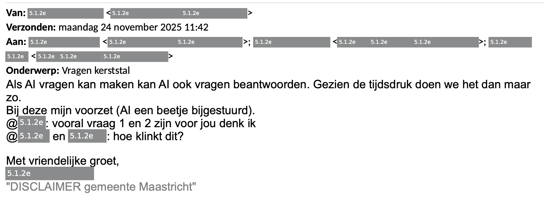 AI alleen blijkt niet voldoende om de antwoorden te completeren. Wat sowieso opvalt in het hele dossier is de enorme ambtelijke inzet die ingezet wordt om de kerststal te faciliteren.
