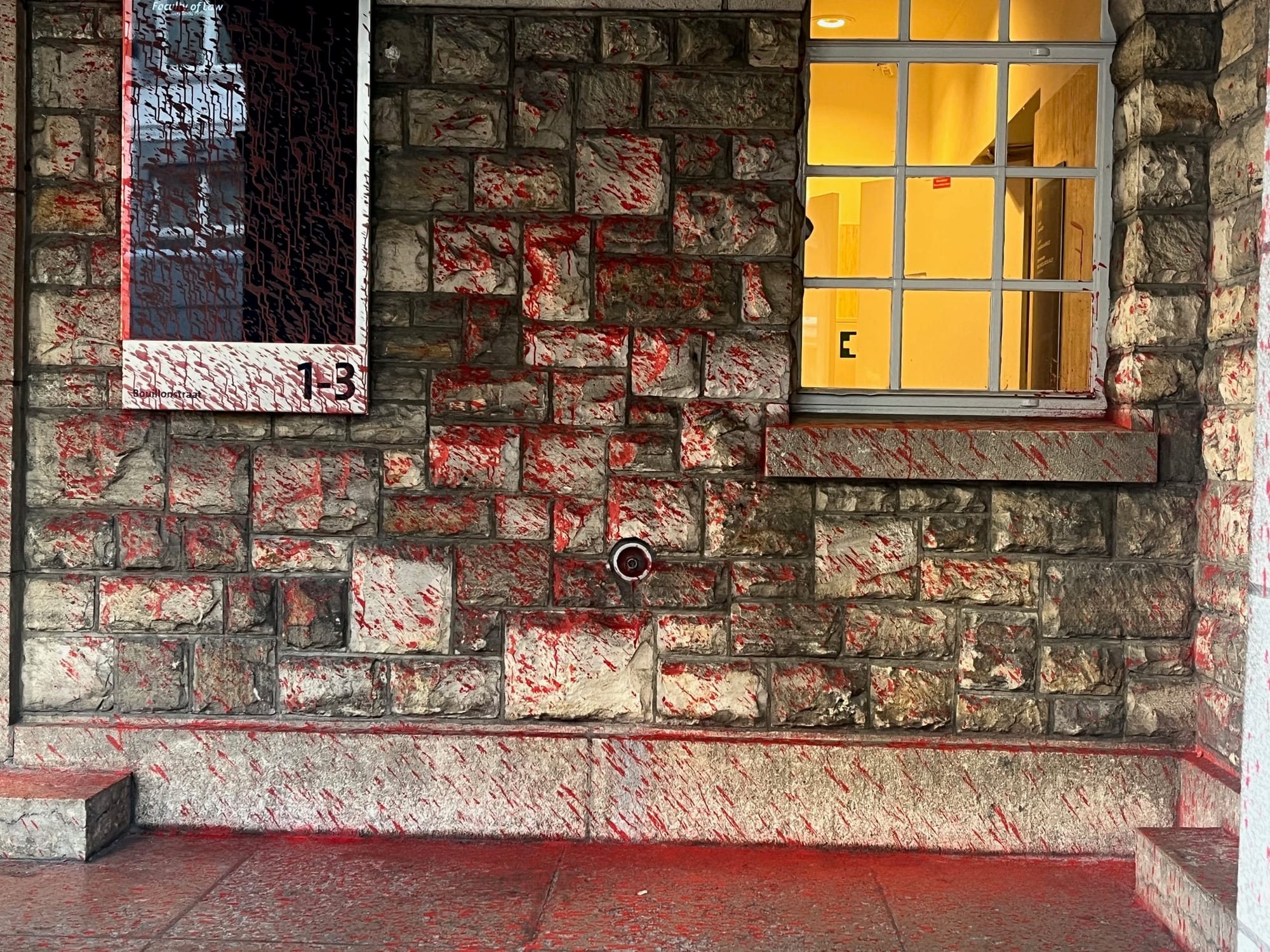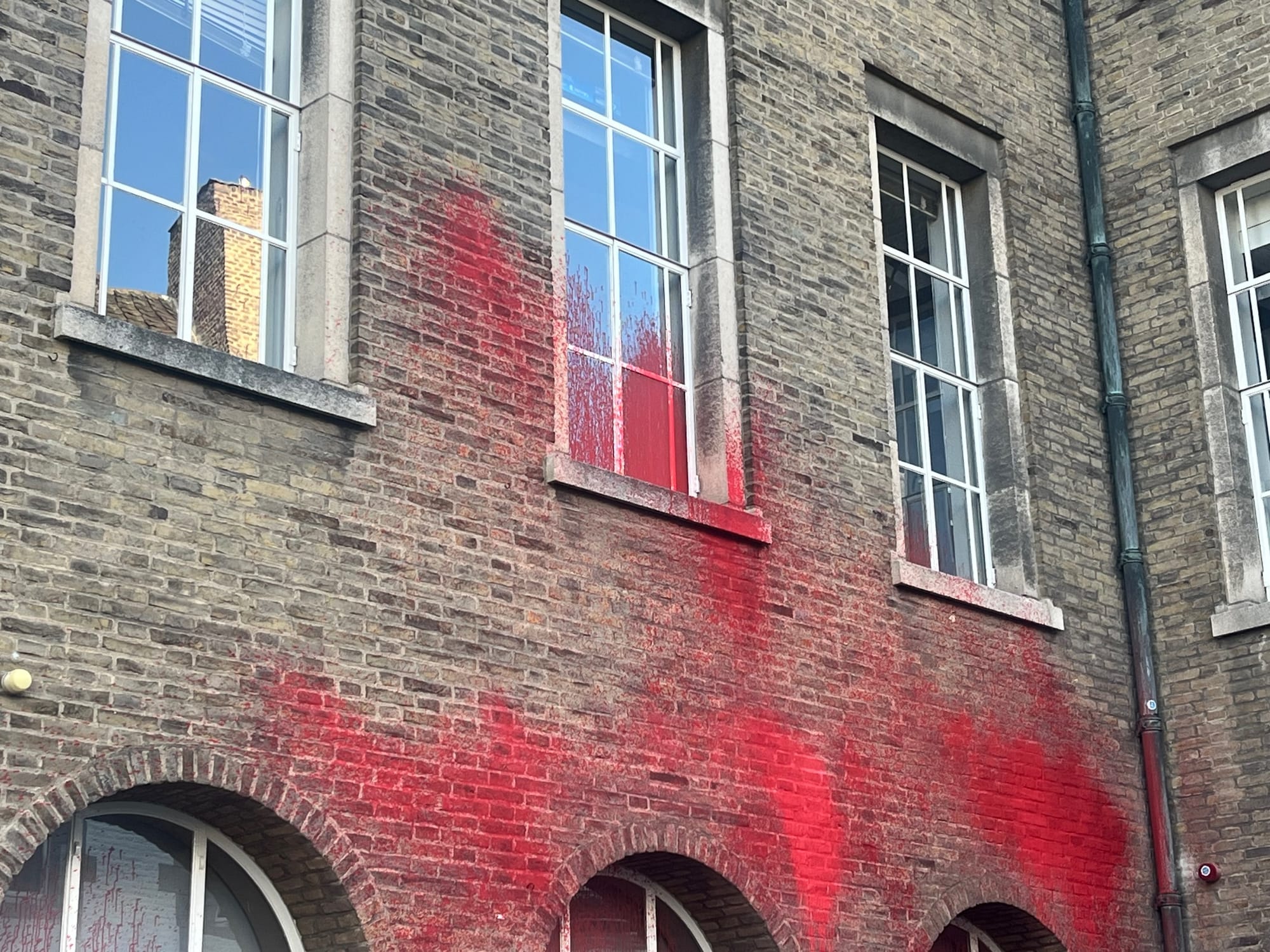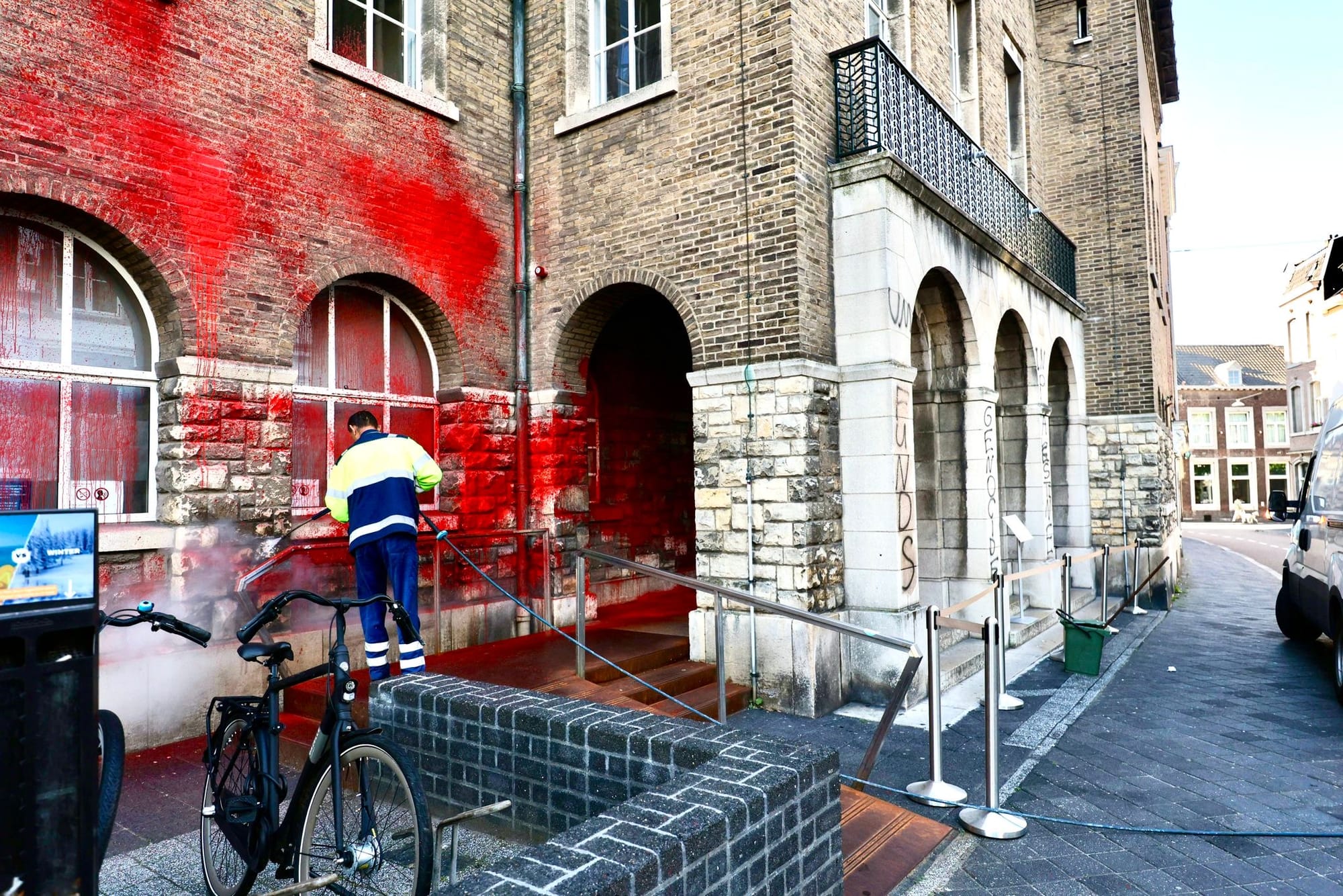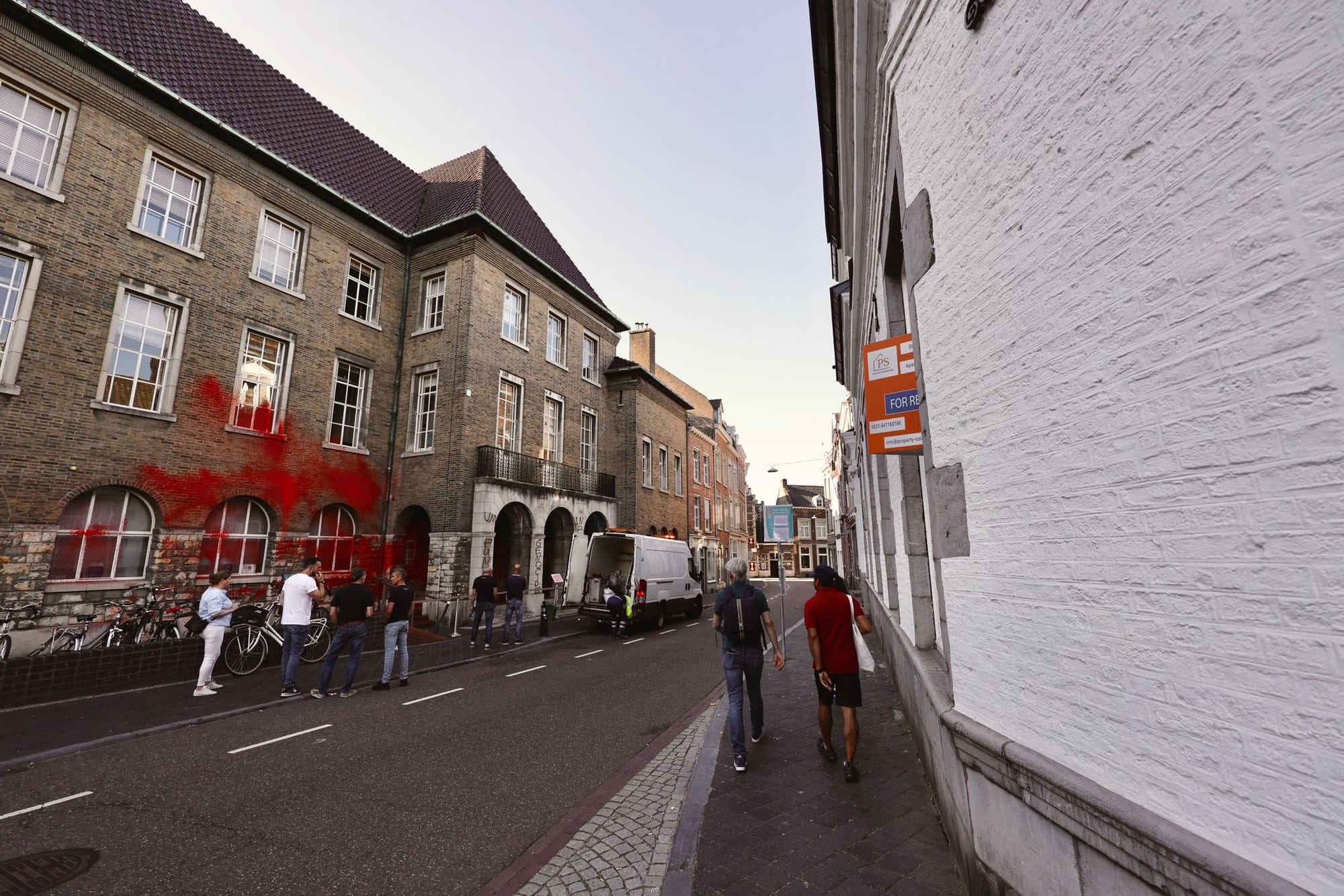 'UM Funds genocide in Palestine' staat er met zwarte verf op het gebouw. Het portaal de toegangsdeur en een deel van de gevel is met rode verf overgoten. De gemeente Maastricht is woensdagmorgen meteen begonnen met het schoonmaken. Daarna is door de universiteit een gespecialiseerd bedrijf ingeschakeld. De universiteit draait ook op voor de schoonmaakkosten.