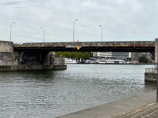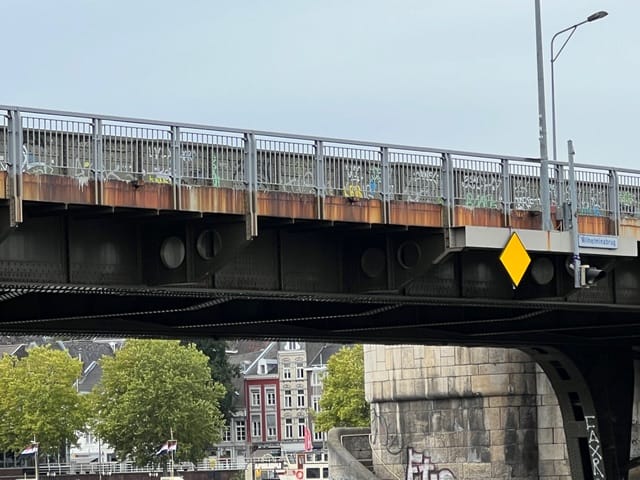 En dan de Wilhelminabrug. Die was wekenlang ingepakt voor een grondige renovatie. Blijkbaar waren aan het eind van de klus de centjes op, want er is geen potje verf meer gekocht om de foeilelijke buitenkant ook onder handen te nemen.