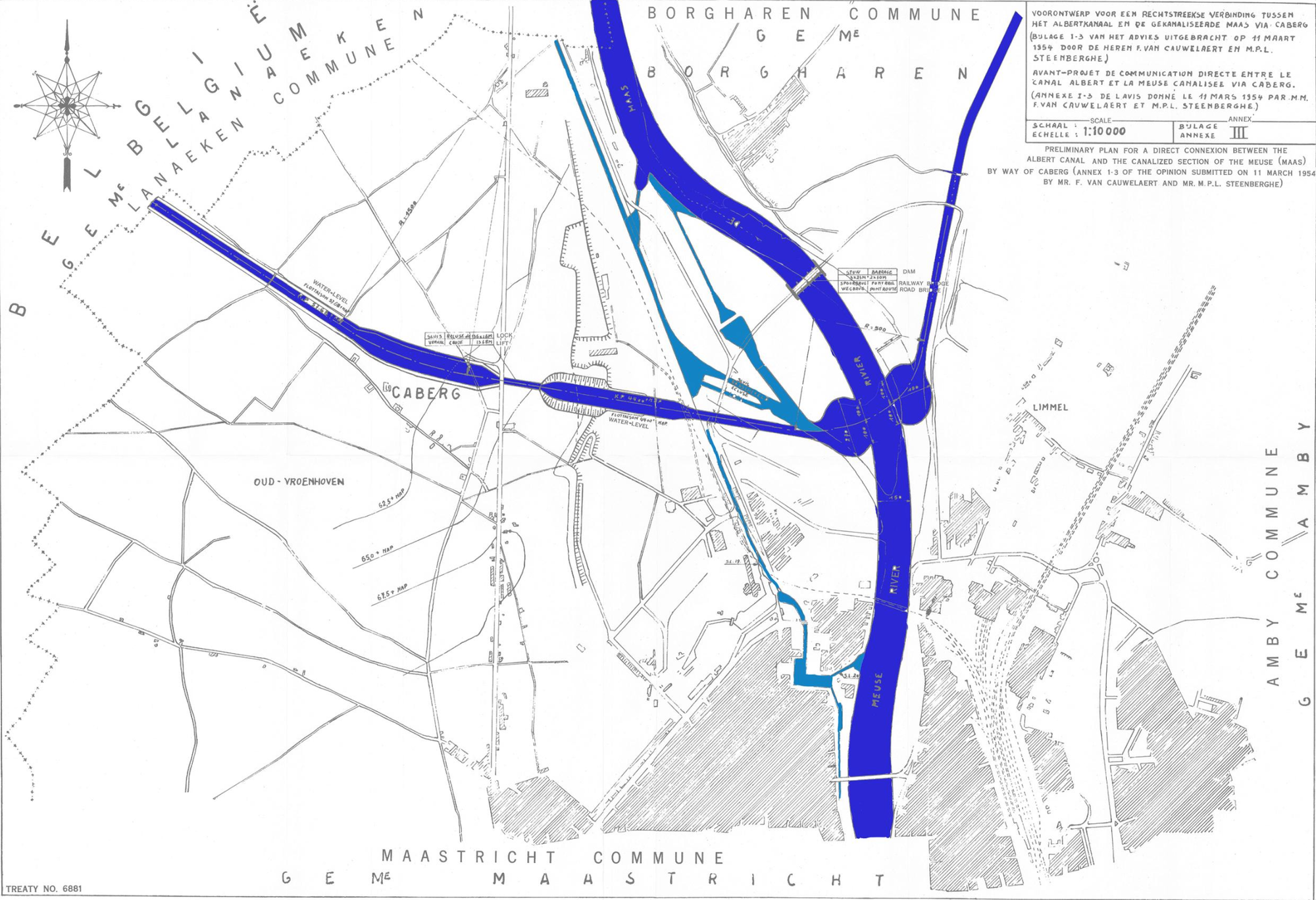 Hoogma laat een kaartje zien. Het is een structuurvisie uit 1973. Het tracė van het kanaal is ingetekend door de gemeente. Die moest dat doen omdat er een Tractaat was tussen Nederland en België om dat kanaal te realiseren. De voorstanders waren de lobby van het bedrijfsleven en de industrie, de Kamer van Koophandel en de lobby van de scheepvaart. Het Cabergkanaal was vooral ingegeven door economische belangen en veilig scheepvaartverkeer. Het gebied in Maastricht en Luik zou dan aangesloten zijn op twee grote wereldhavens.