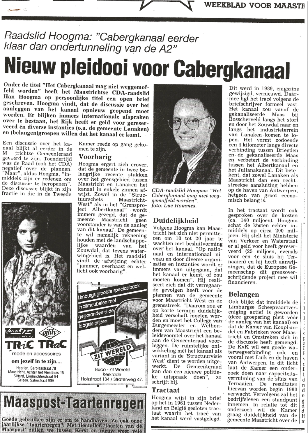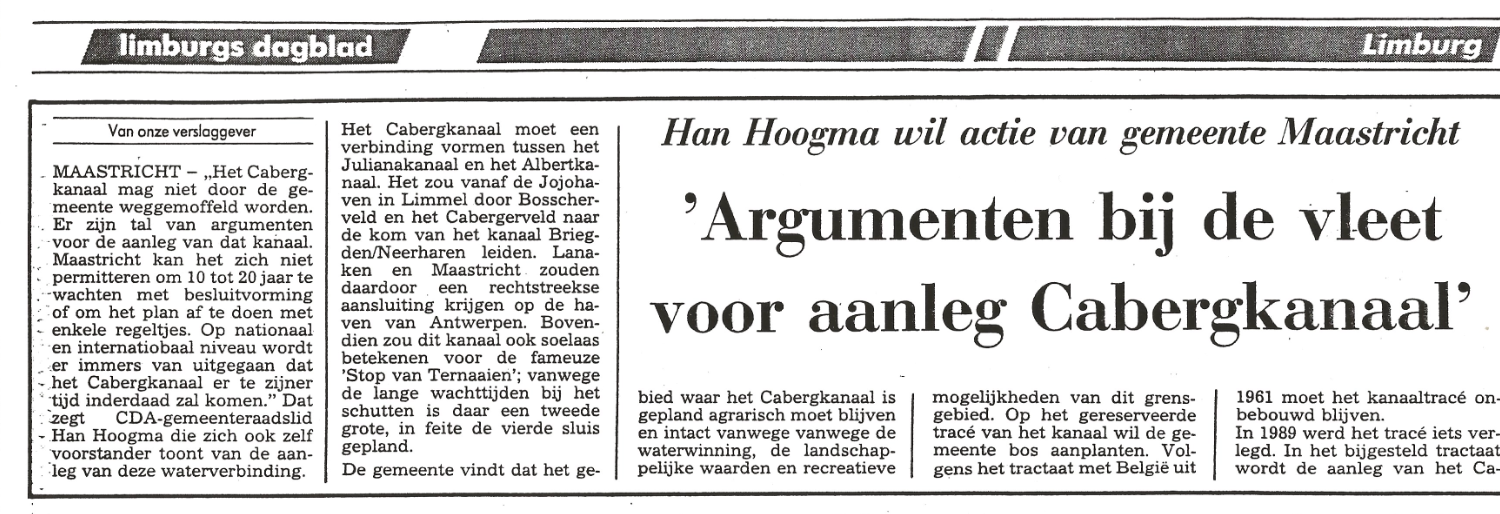 Oud-raadslid en oud-wethouder Han Hoogma was net zo verbaasd over de berichten over mogelijke sloop of andere aanpassingen van de Servaasbrug als tout Maastricht. Hoogma moest meteen denken aan het Cabergkanaal dat er nooit gekomen is: een kanaal tussen het Julianakanaal en het Albertkanaal. De scheepvaart zou dan in beide richtingen om Maastricht heen kunnen varen.