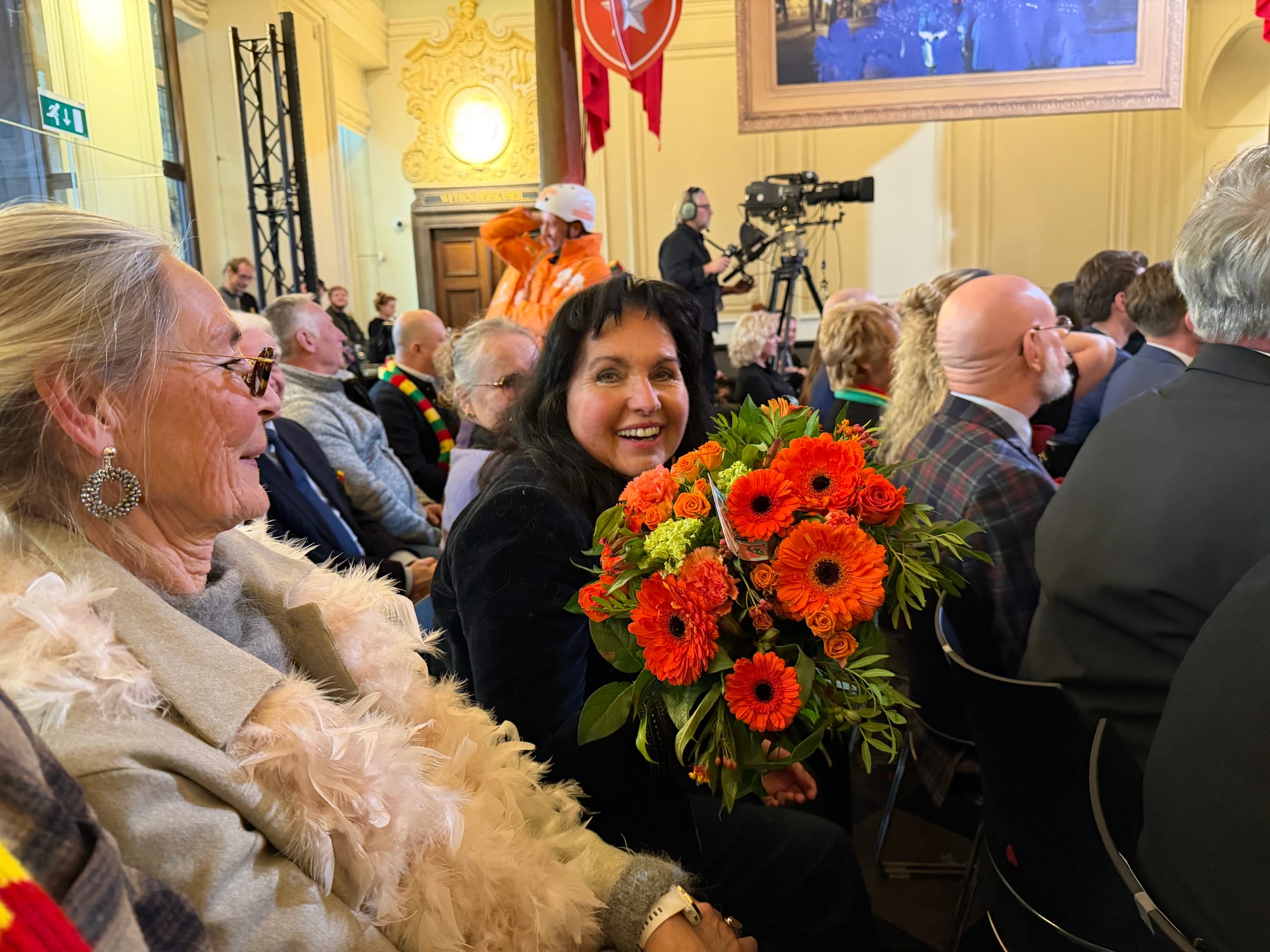 We moeten nog even terug naar de Machseuverdrach. Dit jaar was ze in haar nopjes. Om te beginnen zat ze niet weggestopt achter een dikke pilaar zoals vorige keer. Dit jaar hoefde ze ook niet middels een internationaal erkend communicatiegebaar te laten weten wat ze van een uitspraak van de burgemeester vond. Nee, de door een bezorgscooter aangereden Kitty Nuyts, kreeg een mooie bos bloemen van een van de bodes die voor de gelegenheid als thuisbezorger was verkleed. Sjiek & Sjoen gebaar van de burgemeester.