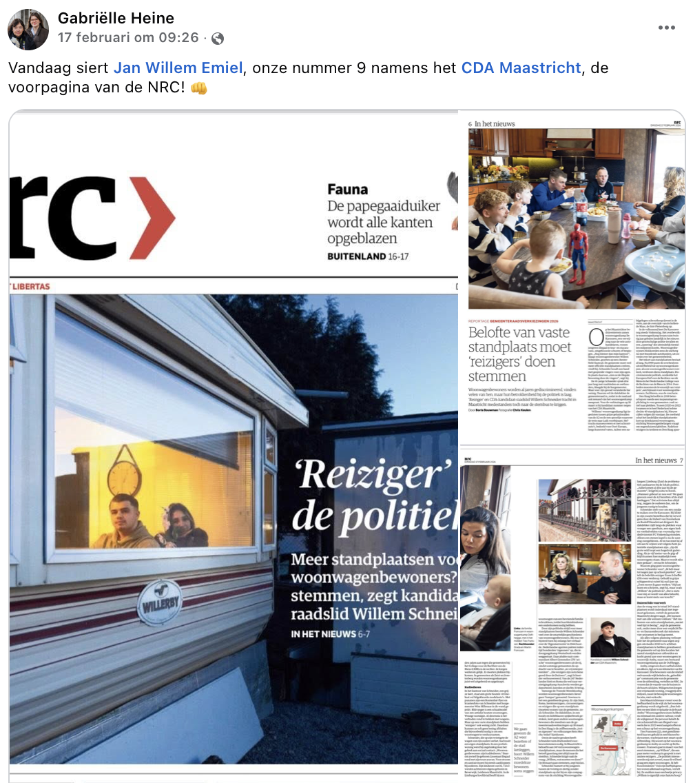 Als de krant vroeger al een meneer was, dan was het NRC/Handelsblad, nu NRC>, een hele deftige meneer. Je weet één ding zeker: dezer dagen weten de media-meneren voor wie de buitenlandredactie begint waar de Randstad eindigt ook Limburg weer te vinden. Om reportages te maken over carnaval, die dan negen van de tien keer de essentie missen. Om te schrijven over Tefaf, want ze zijn best wel jaloers dat ze zo'n topevent niet zelf hebben. In de verkiezingstijd komen ze kijken of Limburg nog achter Geert Wilders staat. En nu was NRC> dus in Maastricht. Voor een reportage vanaf bedrijventerrein/woonwagenkamp Karosseer, waar Willem Schneider nu het stemmenkanon is voor het lokale CDA. Schneider haalde de voorpagina. Gabriëlle Heine is er maar wat trots op. Het is natuurlijk ook sjiek!