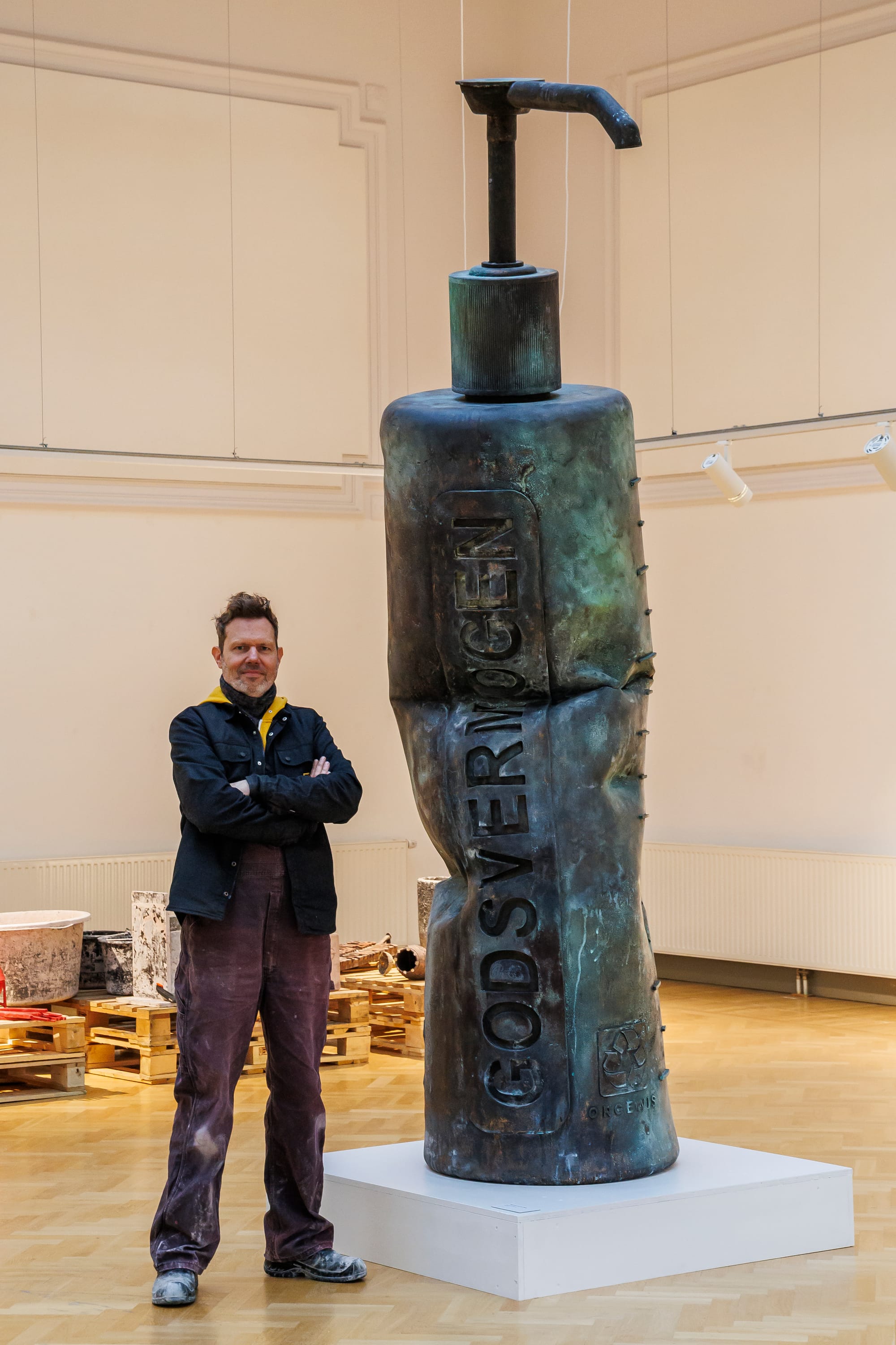 Momenteel is zijn expositie Godsvermogen te zien bij Bureau Europa. Het is pas zijn tweede expositie. “De openbare ruimte heeft toch mijn grote voorliefde”, legt Maarten uit. “Kunst in publieke ruimte is wat mij betreft hoogst haalbare podium. Het is voor iedereen toegankelijk of je nu geld hebt of niet en of je nu kenner bent of niet. Iedereen mag zijn mening vormen, je kunt er, bij wijze van spreken, overheen pissen.” Blikvangerstijdens de expositie zijn het beeld Ode aan de stad. Een amfoor met rondom een gedicht van Maarten. Maar ook de zeepdispenser springt letterlijk in het oog. “Dit beeld heb ik samen met Marco gemaakt. Ik heb er drie jaar voor gespaard en Marco heeft het in beginsel tegen kostprijs gegoten. Daar ben ik hem zeer dankbaar voor. Het beeld is zonder sokkel 3,20 meter hoog. Ik wilde altijd al een meer dan levensgroot beeld maken en dat is gelukt.”