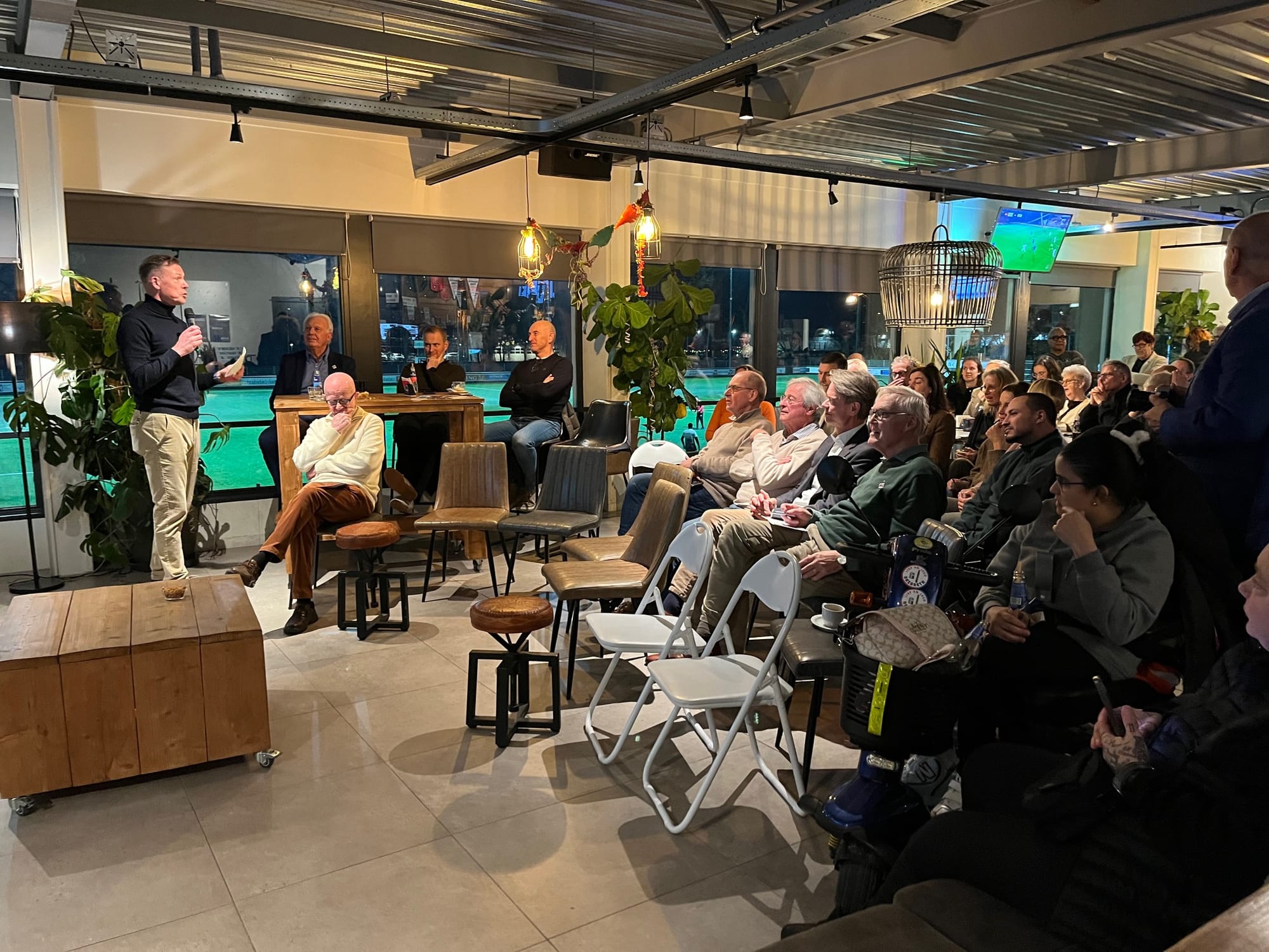 De Senioren Stadspartij Maastricht had een heel blik ex-topsporters uitgenodigd om van gedachten te wisselen in een volle kantine. Oud-profvoetballer Erik Meijer leidde de discussie met onder meer hardloper Jo Schoonbrood "ik heb inmiddels vier keer de aarde rond gerend", Bertil Kaanen, oud-zwemmer en Frans Verhaegen van Verhaegen Sports Boxing. Ook Liesbeth van Vliet van UM Sports zat in het panel. Maar liefst 6500 studenten doen in Maastricht aan sport vertelde ze.