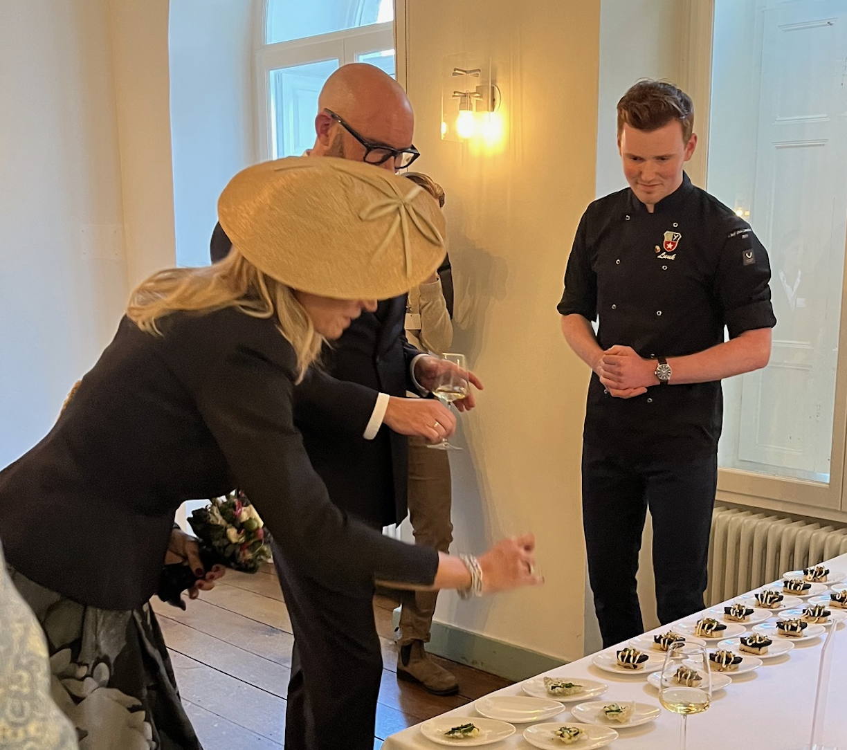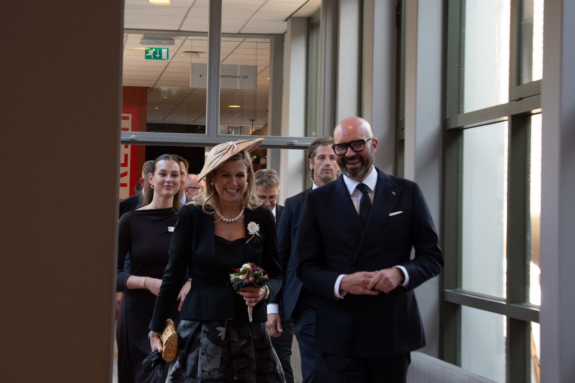 Koningin Máxima maakte ook kennis met de nieuwste voedseltechnieken, zoals het 3D-printen van voedsel, een slimme manier om verspilling tegen te gaan. In de Franse zaal boden de studenten van wijngenootschap Caves d'Amphitryon de Koningin de keuze tussen een Chablis of een alcoholvrije wijn. Máxima koos voor het tweede. "Het is nog vroeg", zei ze lachend tegen de studenten. Iets verderop gaf student Luuk Kemmeren uitleg over de kookclub Société Gastronomique. Hier kon de koningin kiezen uit twee amuses. "De vegetarische variant uiteraard", was haar antwoord op de vraag welk gerecht ze wilde proeven.