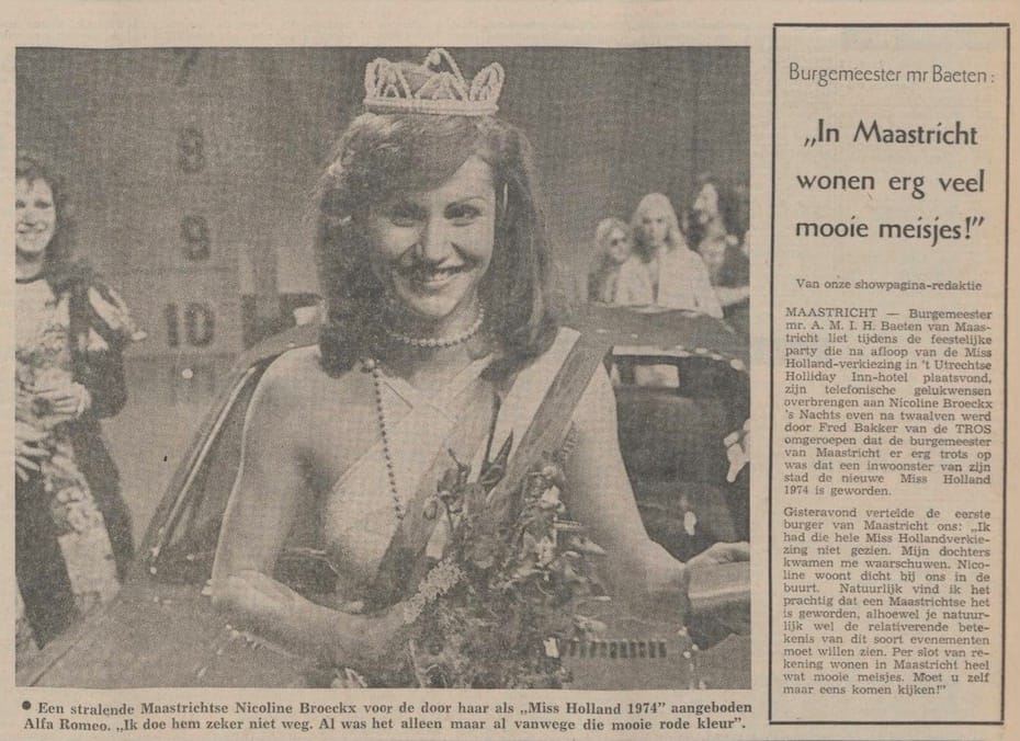 Het jaarboek van Maastricht over 1974 schrijft er zelfs over. Het jaaroverzicht begint met het feit dat de politie handenvol werk had met de jaarwisseling. Er waren verontrustend veel inbraken en vernielingengepleegd. Om te vervolgen met: “Genoeg over dit sombere begin. Nog geen vijf dagen later brak de zon door en zagen we op de t.v., dat een Maastrichts meisje, de 20-jarige Nicoline Broeckx, tot Miss Holland werd uitgeroepen. Daar boven de rivieren geven ze nu eindelijk toe dat de mooiste meisjes in Maastricht wonen.”