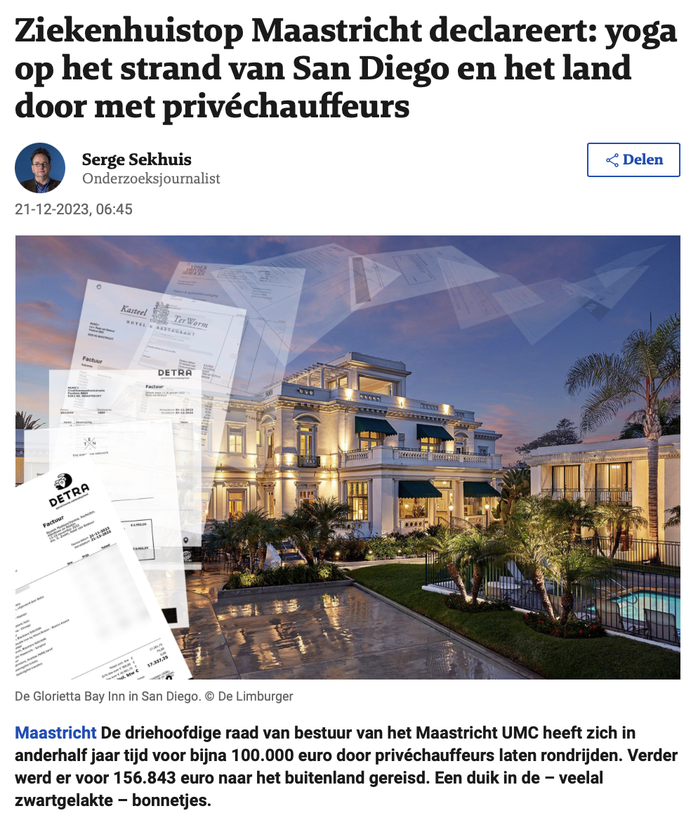 In het geval van Helen Mertens is er niet meer heel veel krediet over. Ze kwam persoonlijk, samen met andere bestuursleden, in 2023 in opspraak vanwege royaal declaratiegedrag. Yoga-lessen op exotische stranden werden zelfs gedeclareerd. Dan gaat het niet om de kosten, maar om het Zonnekoninginne-gedrag dat je daarmee etaleert. De Limburger onthulde het declaratiegedrag minitieus, al waren vele stukken die ze op grond van de Wet Open Overheid kreeg zwartgelakt. Elk etentje, elke taxirit, elke businessclass-vlucht werd in kaart gebracht. En dat viel niet goed bij personeel en vakbonden. Andere zorgbestuurders wezen het declaratiegedrag - anoniem - af. Het ziekenhuis nam het op voor het bestuur en Mertens zelf beloofde een soberder declaratiegedrag in het vervolg.