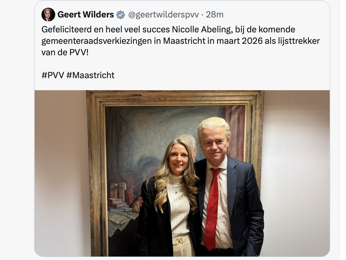 Nicolle Abeling (33) gaat voor de PVV in Maastricht meedoen aan de gemeenteraadsverkiezing. Geert Wilders van de PVV heeft dat bekendgemaakt op X.