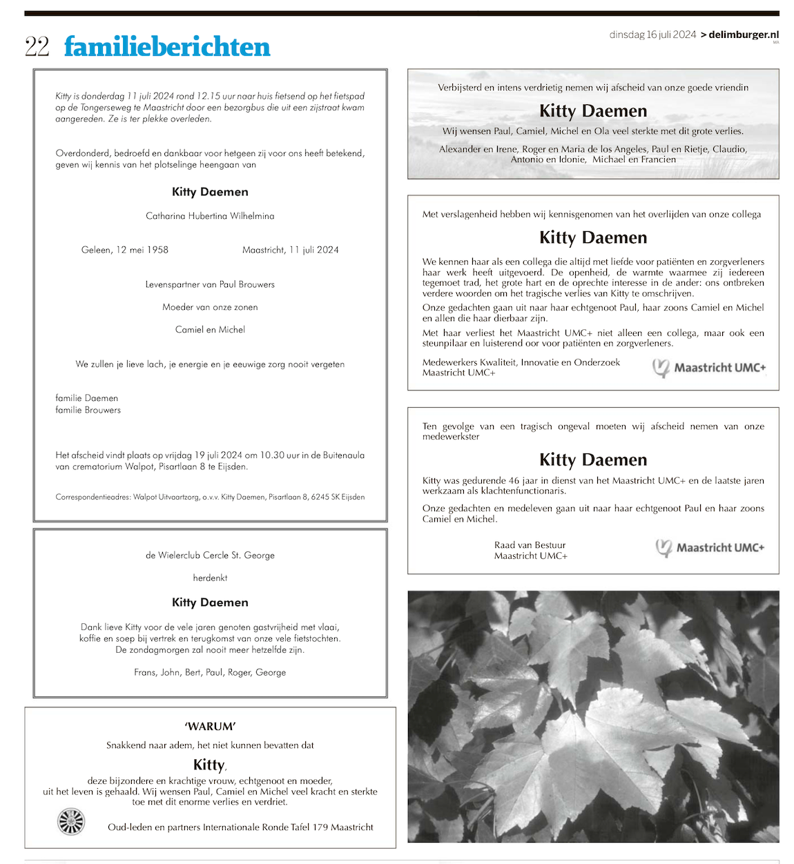 Een zeer indrukwekkend verhaal vertelde advocate Sarina Hensen vrijdag in de rechtbank namens de nabestaanden van Kitty Daemen. De bij familie, vrienden, bekenden en collega's zeer geliefde vrouw overleed in de zomer van vorig jaar toen ze op haar fiets werd aangereden door een bestelbus op de Tongersweg.