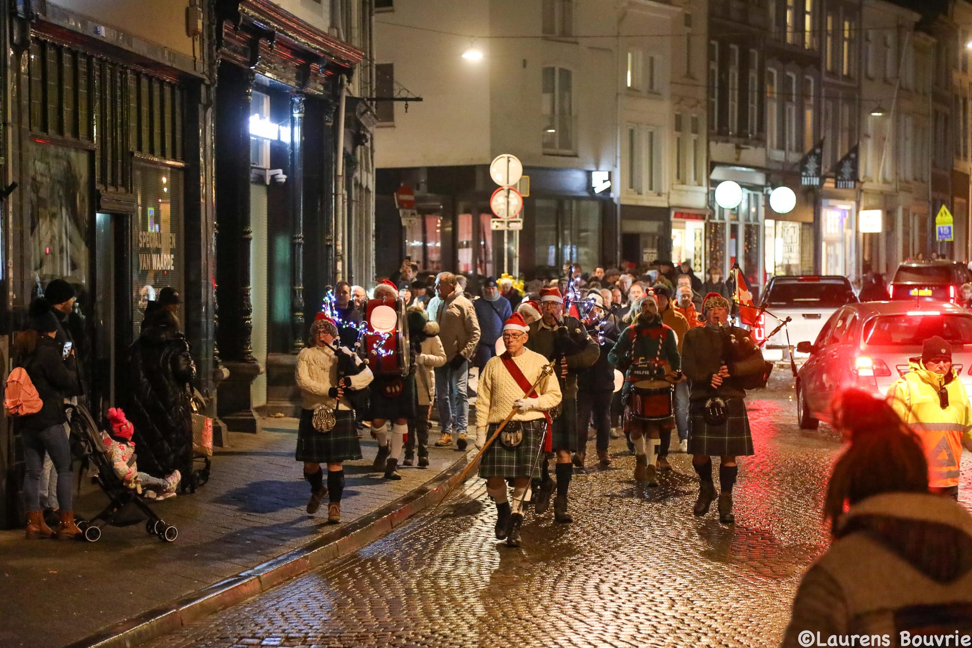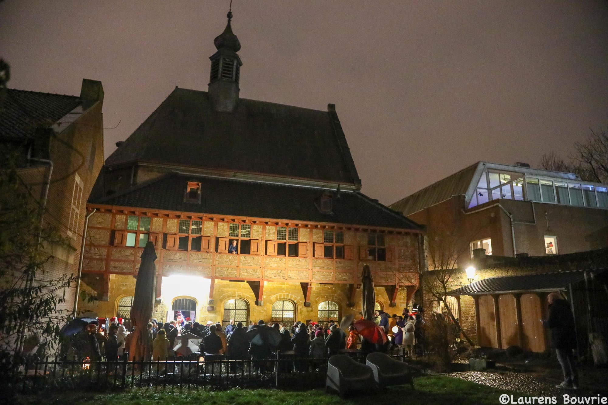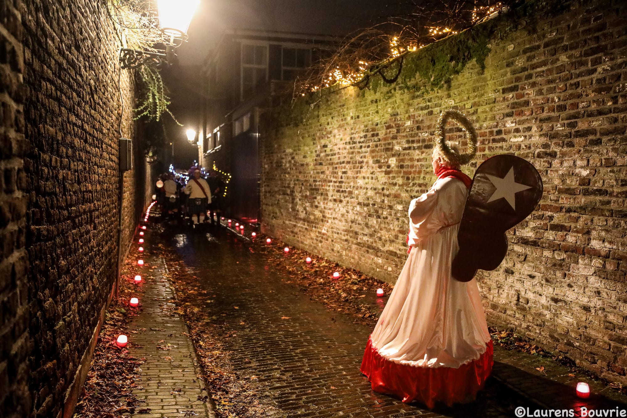 Stadsverteller Jan Janssen hangt uit een van de raampjes van de achter huizen verscholen Cellebroederskapel aan de Brusselsestraat. Het is de laatste van drie locaties waar hij en Theo Bovens kerstverhalen vertellen. Het is nog even wachten op de deelnemers aan de Keersnach vaan ’t Hart. Het steegje naar de kapel is warmrood verlicht. Vanuit de Brusselsestraat is de aankomst van de deelnemers te horen. Vanaf de start loopt Maastricht Pipers met doedelzakmuziek voorop.