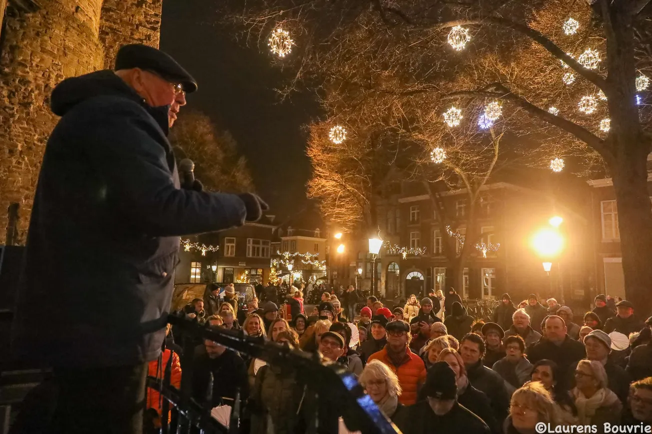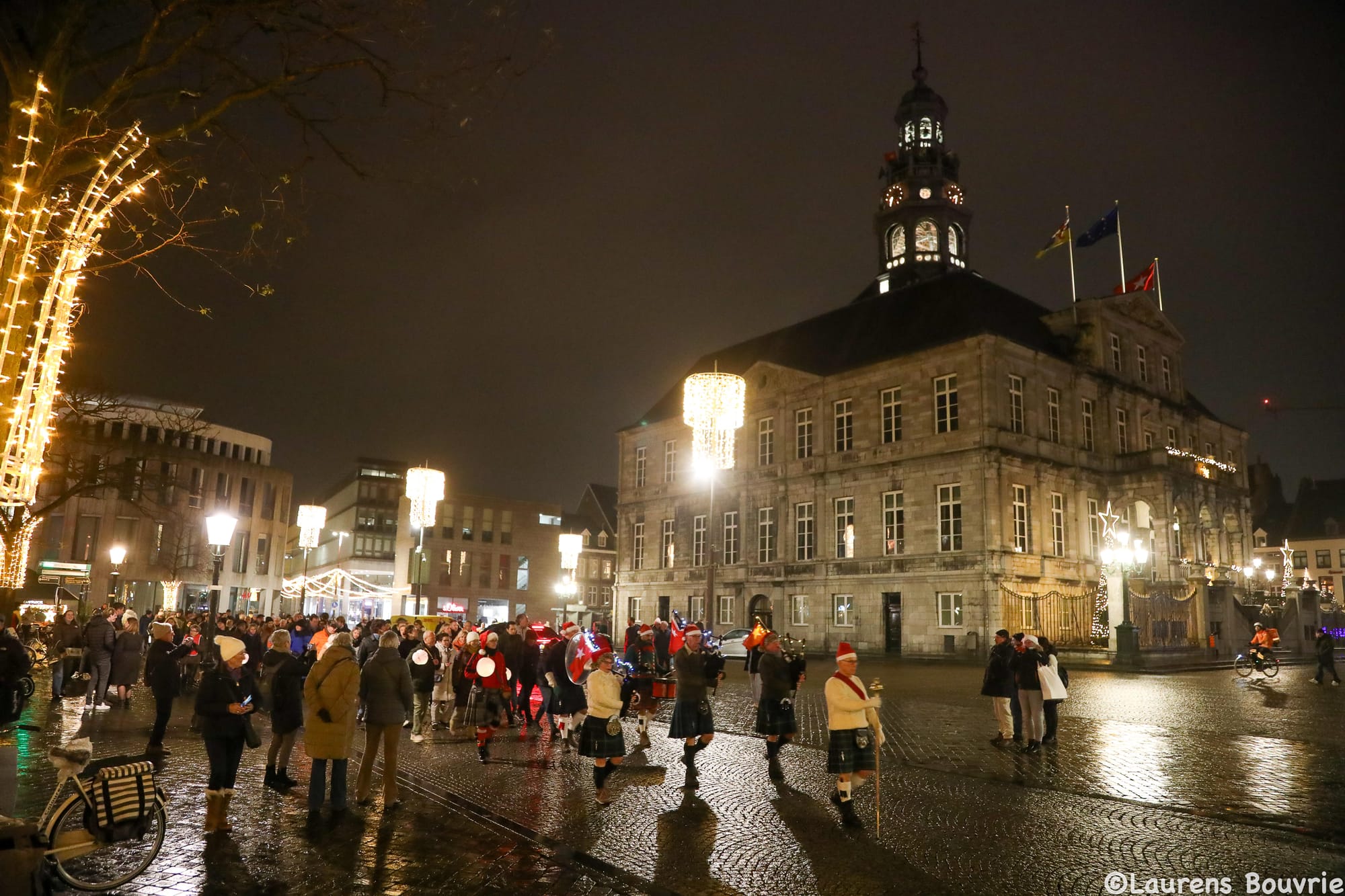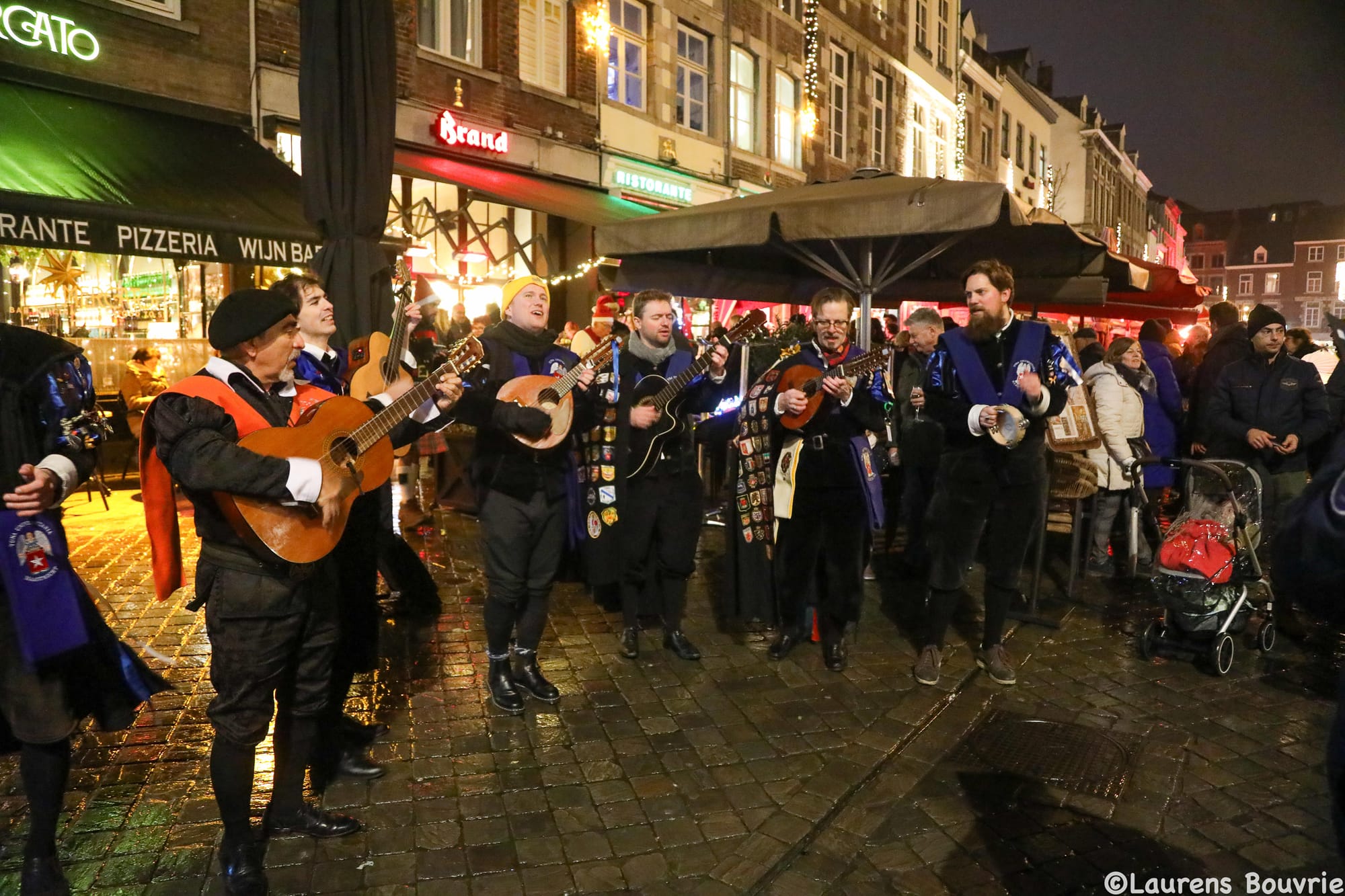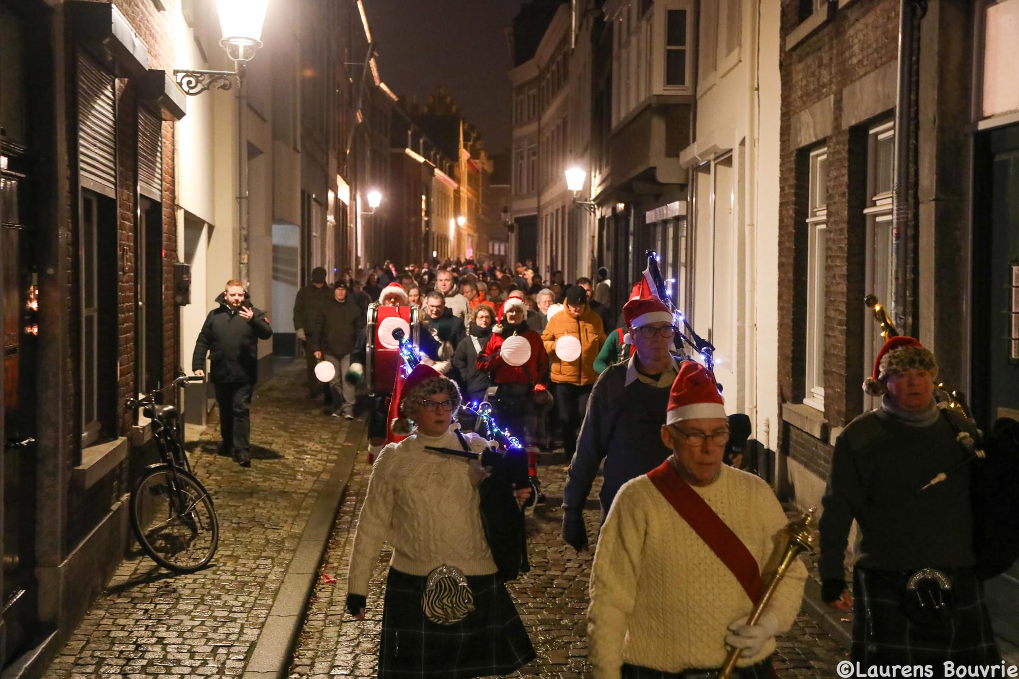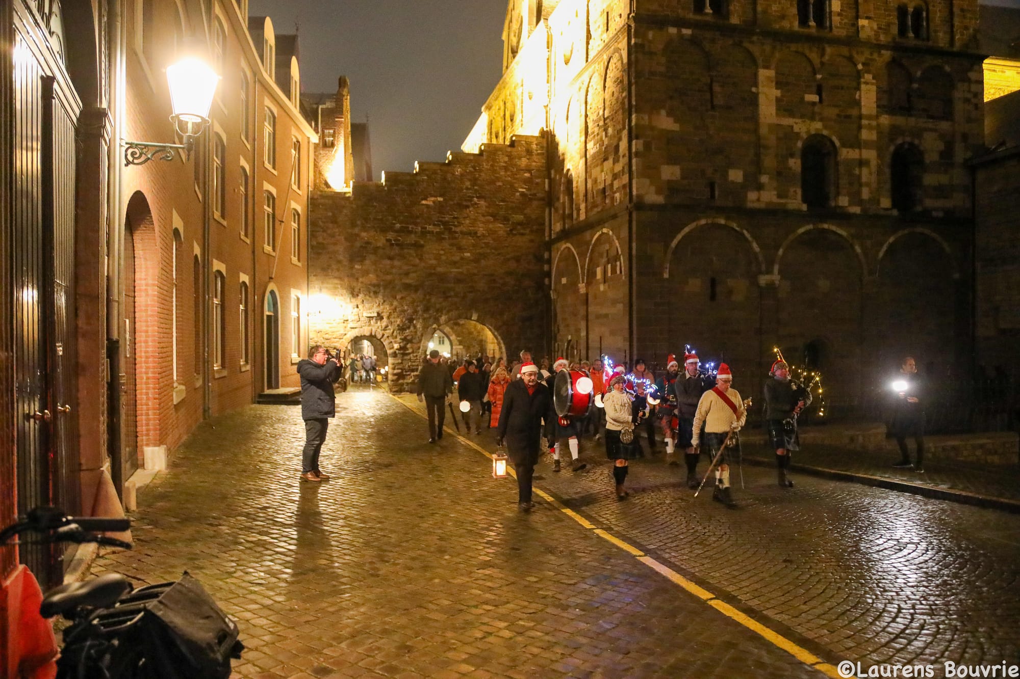 Wellicht onbedoeld maar wel zeer prettig is dat de wandeling van de Keersnach vaan ’t Hart op deze waterkoude zaterdag niet alleen bij de deelnemers een warm gevoel geeft. De stoet die, vanaf de Brusselsestraat via het Sint Servaasklooster en de Lenculenstraat een eerste stop maakt bij de huivende (red: knikkerende) kinderbeeldengroep op de hoek van de Witmakerstraat en Hondsstraat, geeft ook passanten in de gezellig drukke binnenstad een extra kerst-emotie mee. De eerdergenoemde Maastricht Pipers wisselen met Tuna Universitaria de Maastricht elkaar af om de tocht muzikaal te omlijsten. Beide groepen passen perfect in de sfeer van de eeuwenoude straatjes en pleinen die in de route zijn opgenomen. En dan zijn er nog de verhalenvertellers. Laat Jan Janssen uit eigen koker op eigen sappige Mestreechter wijs zijn verhalen tot leven komen voor de Slevrouwebasiliek en bij de Cellebroederskapel. Oud-gouverneur Theo Bovens doet zijn verhaal vanaf het altaar in de Sint Mathijskerk aan de Bosschstraat.