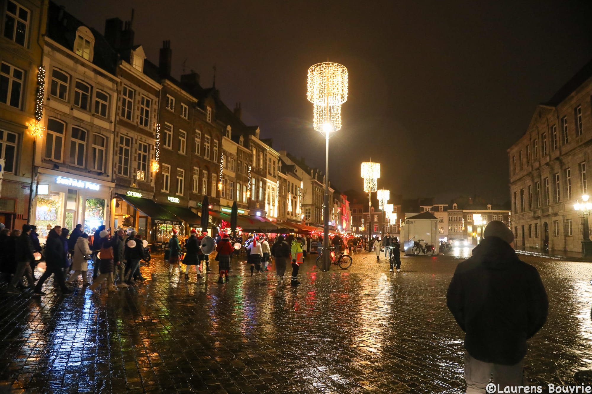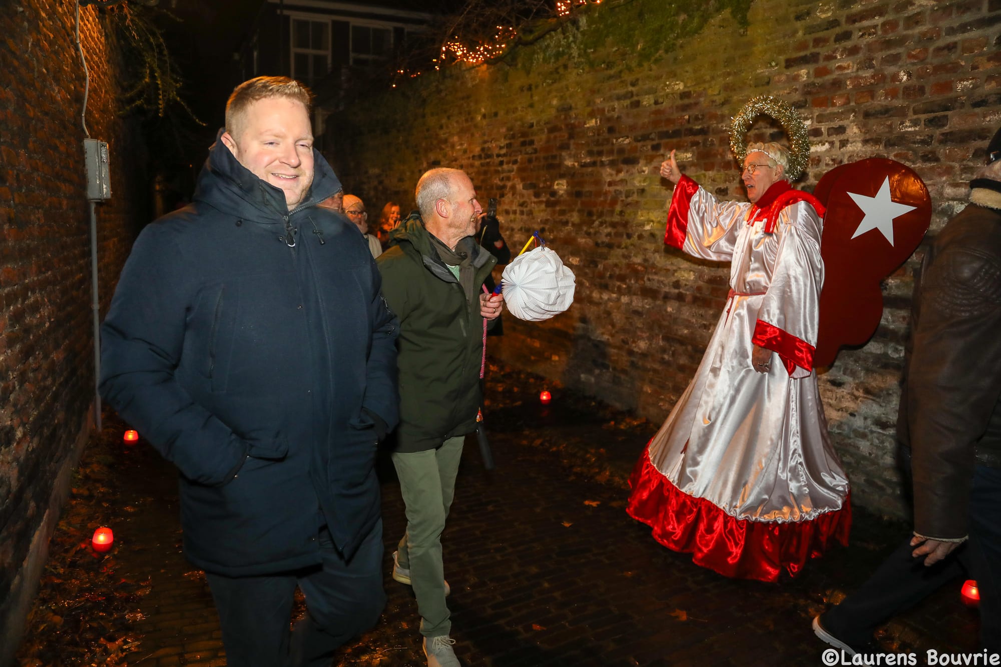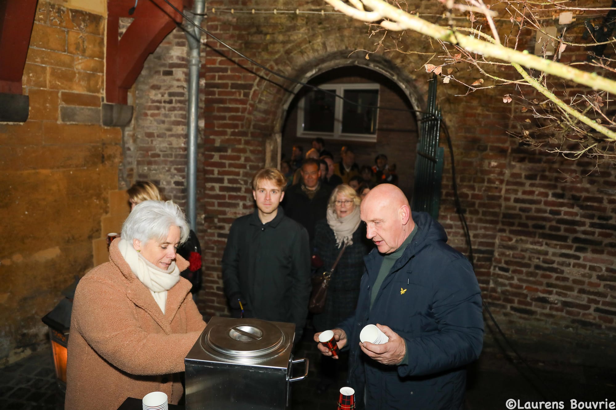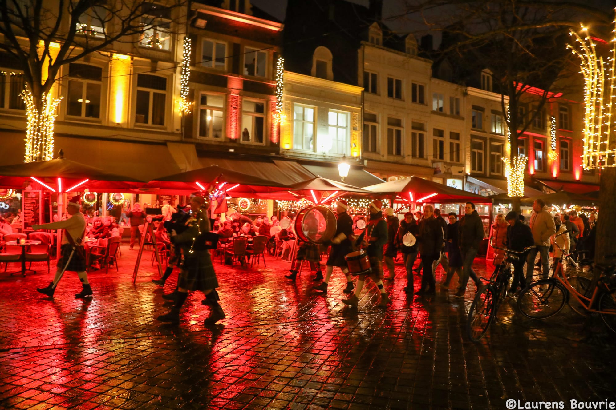 Wellicht onbedoeld maar wel zeer prettig is dat de wandeling van de Keersnach vaan ’t Hart op deze waterkoude zaterdag niet alleen bij de deelnemers een warm gevoel geeft. De stoet die, vanaf de Brusselsestraat via het Sint Servaasklooster en de Lenculenstraat een eerste stop maakt bij de huivende (red: knikkerende) kinderbeeldengroep op de hoek van de Witmakerstraat en Hondsstraat, geeft ook passanten in de gezellig drukke binnenstad een extra kerst-emotie mee. De eerdergenoemde Maastricht Pipers wisselen met Tuna Universitaria de Maastricht elkaar af om de tocht muzikaal te omlijsten. Beide groepen passen perfect in de sfeer van de eeuwenoude straatjes en pleinen die in de route zijn opgenomen. En dan zijn er nog de verhalenvertellers. Laat Jan Janssen uit eigen koker op eigen sappige Mestreechter wijs zijn verhalen tot leven komen voor de Slevrouwebasiliek en bij de Cellebroederskapel. Oud-gouverneur Theo Bovens doet zijn verhaal vanaf het altaar in de Sint Mathijskerk aan de Bosschstraat.