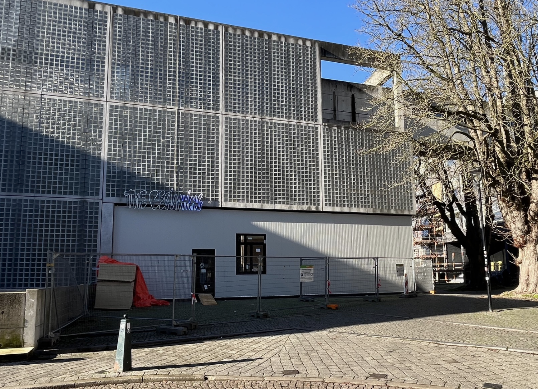 Bewoners aan het Herdenkingsplein keken raar op toen bouwbedrijf BAM begon met de verbouwing van de Kunstacademie en Architectuur Academie. Het door architect Wiel Arets ontworpen gebouw van glas en beton met onderdoorgang ziet er voorlopig even heel anders uit.