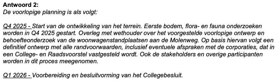 Dat blijkt uit antwoorden van wethouder Johan Pas op raadsvragen van Gabriëlle Heine van het CDA. Heine had eerder gehoord dat het elf jaar zou gaan duren voordat er woonwagens zouden staan en stelde daarover vragen. Heine wijst in die op procedures die het Rijk in voorbereiding heeft om alle noodzakelijke trajecten die doorlopen moeten worden te bekorten. 'Snelheid in het proces', heet die aanpak.