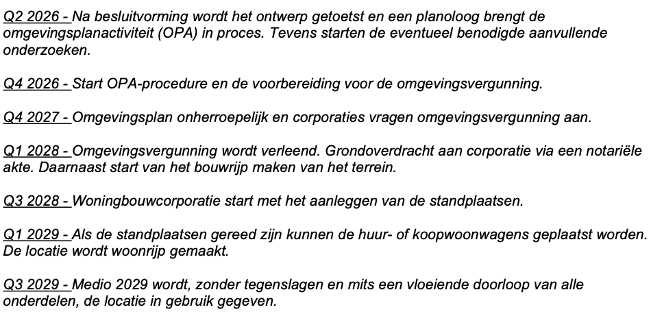Met de maximale snelheid is bij de verwachte oplevering over vijf jaar al rekening gehouden zo laat Pas weten: "Het meest op elkaar afgestemde scenario waar zoveel mogelijk onderdelen van de uitvoering planmatig naast elkaar of direct aansluitend plaatsvinden, levert een planning op van 5 jaar. De standplaatsen zijn in die planning gereed eind 2029. Onder andere bezwaar en beroep procedures kunnen voor vertraging in deze planning zorgen."