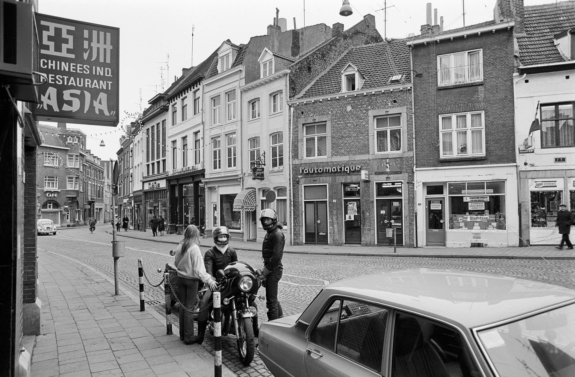 Fotograaf Loek Tangel stond in februari 1979 op de Brusselsestraat. Zijn lens was gericht naar de locatie waar we anno 2025 Café Paulus vinden, voorheen bekend als Café de Poort. Links op de voorgrond is het uithangbord van Chinees-Indisch restaurant Asia te zien. Dit restaurant opende onder de naam Ah-Tsjoe (Asia) in december 1954 de deuren op nummer 12. Schuin aan de overkant, waar de mensen lopen met de rug naar de camera gekeerd, zien we de naam van René Pans aan de gevel hangen. Op dinsdag 28 april 1970 werd deze zaak in “stijlmeubelen” op nummer 11 geopend. De winkel had destijds met een oppervlakte van 1.500 m2 de grootste showruimte tot ver in de omtrek.