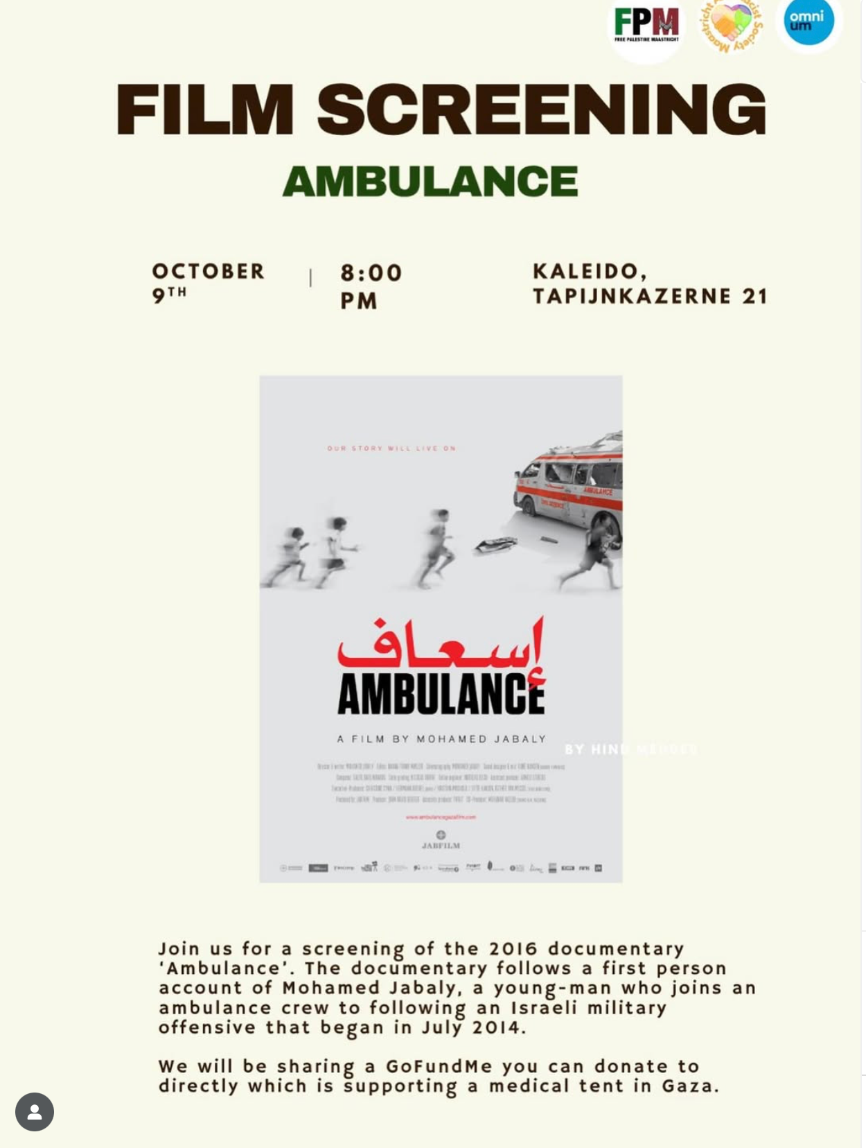 Het door de universiteit gefinancierde OmniUM verbindt zich nu nadrukkelijk met de Palestijnse zaak, door samen met de Free Palestine Maastricht op een affiche te gaan staan voor een film op 9 oktober. Te zien was de film Ambulance, waarbij een ambulance in Gaza gevolgd werd tijdens het optreden van het Israëlische leger in 2014.