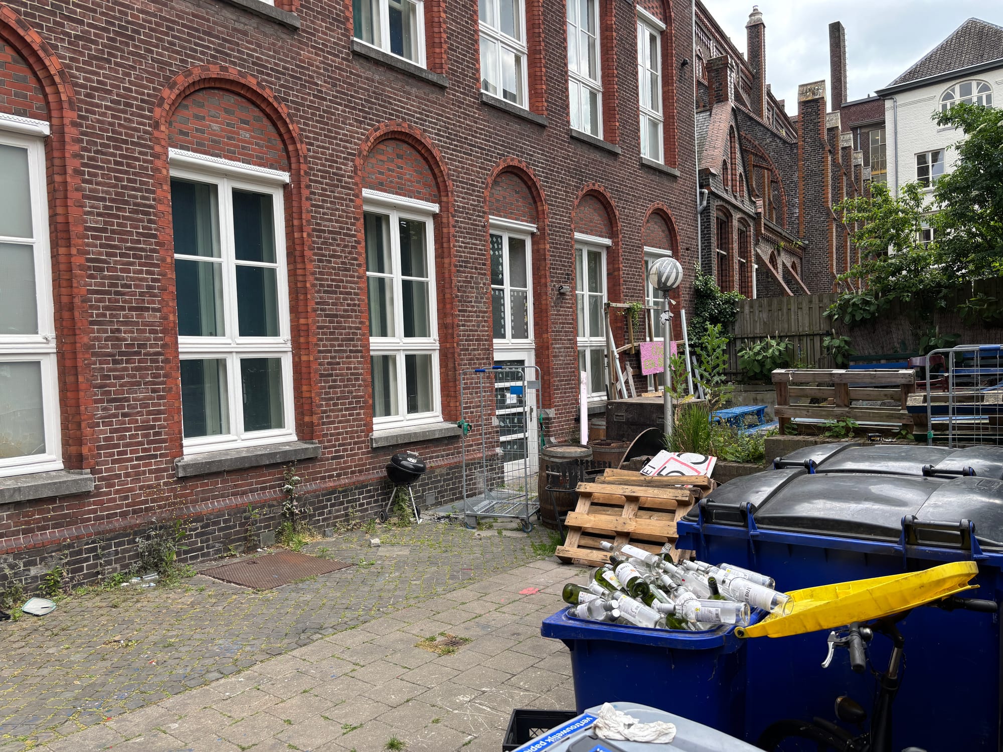 Het pand van Circumflex, de toegangsdeur en de achterom. Kennelijk lusten de studenten wel een wijntje.
