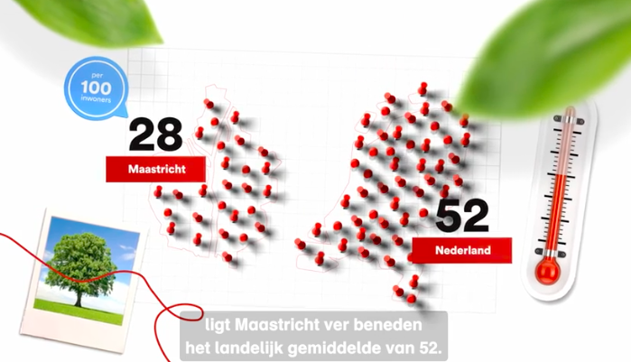 Landelijk gezien hebben steden per 100 inwoners 52 bomen tot hun beschikking. In Maastricht komen we niet verder dan 28 bomen en dat terwijl elke boom zorgt voor verkoeling in een hete, versteende binnenstad. Vooral in nieuwbouwwijken in het centrum ontbreekt het aan groen, omdat projectontwikkelaars vooral zo veel mogelijk woningen willen neerzetten zoals in het Sphinx Zuid is gebeurd. Daar is zelfs een speciaal buurtcomité dat zich inzet om de wijk groener te krijgen.