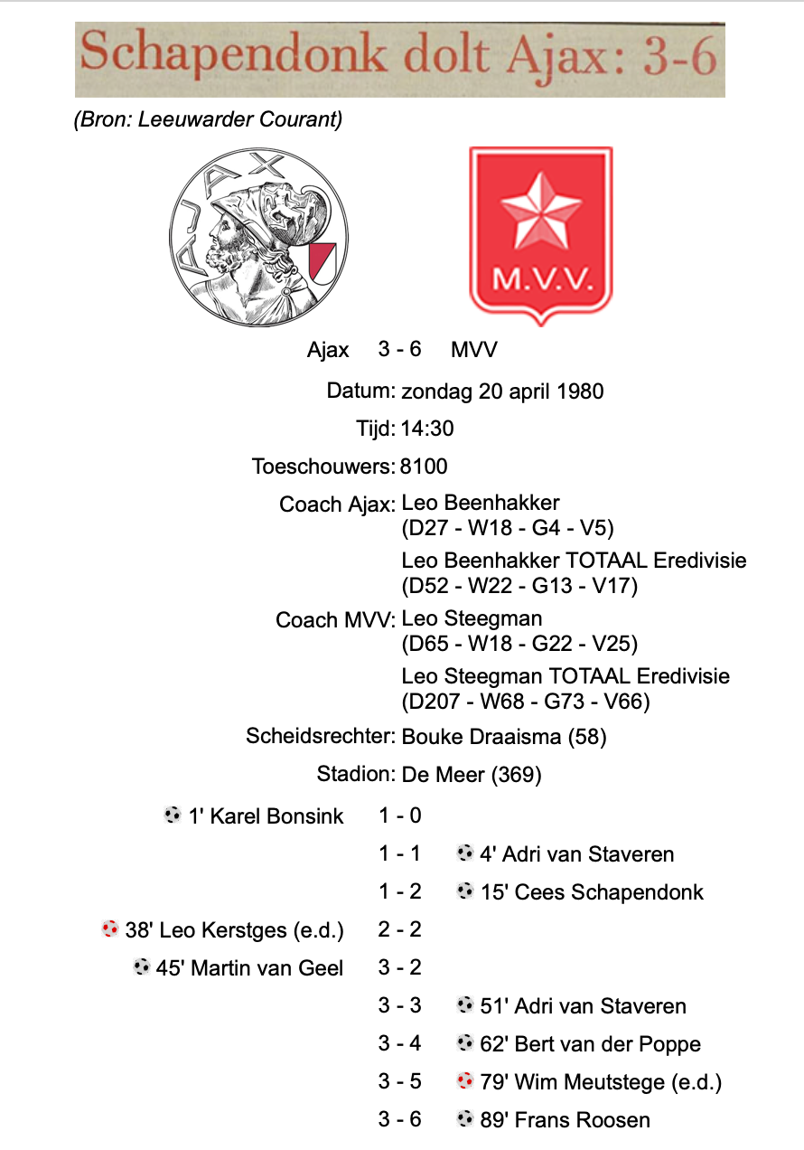 Op zondag 20 april 1980 zag Steegman hoe MVV Ajax in Amsterdam versloeg met 3-6. Het is nog altijd een van de pijnlijkste nederlagen van Ajax in eigen huis.
