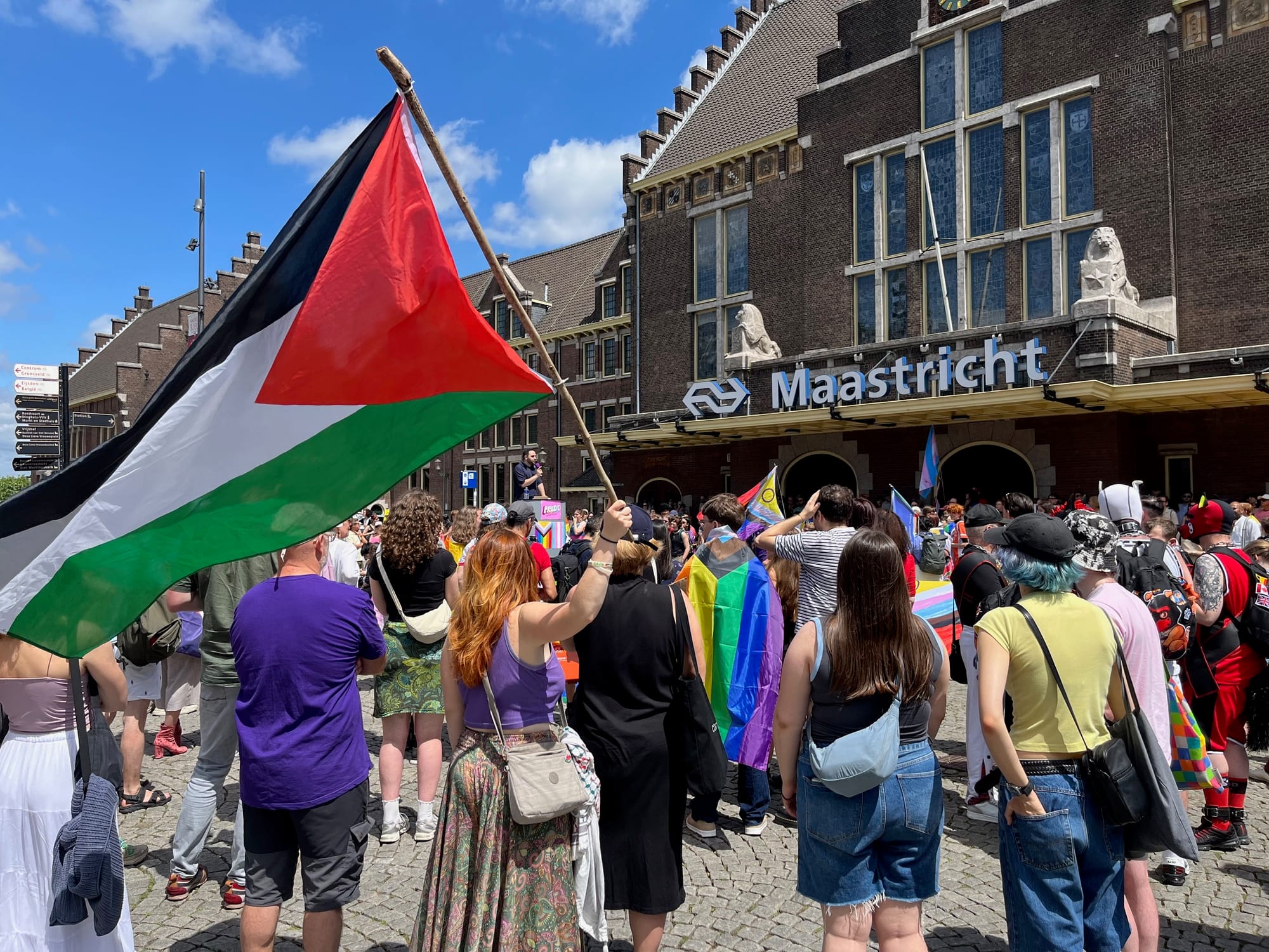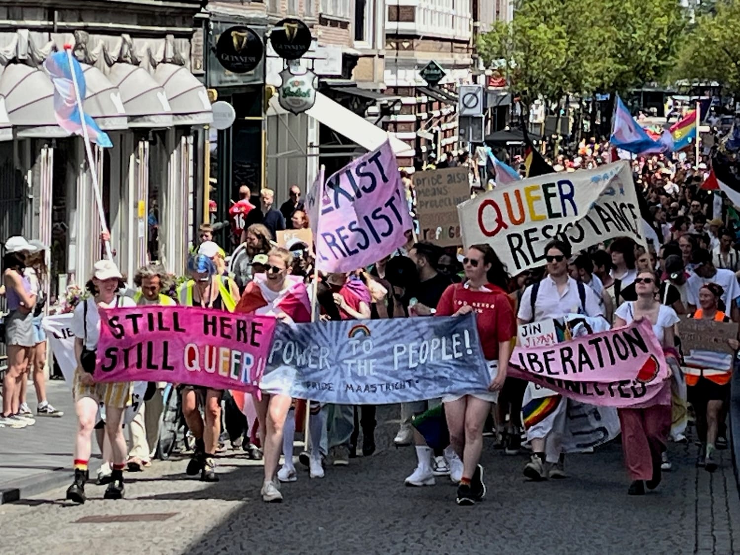 'Still here, Still queer. Dat was de boodschap van de protestmars Pride Maastricht zaterdag. Voor de zesde keer werd Pride Maastricht gehouden en dit keer namen meer dan driehonderd mensen deel aan de mars van het Stationsplein naar het Stadspark.