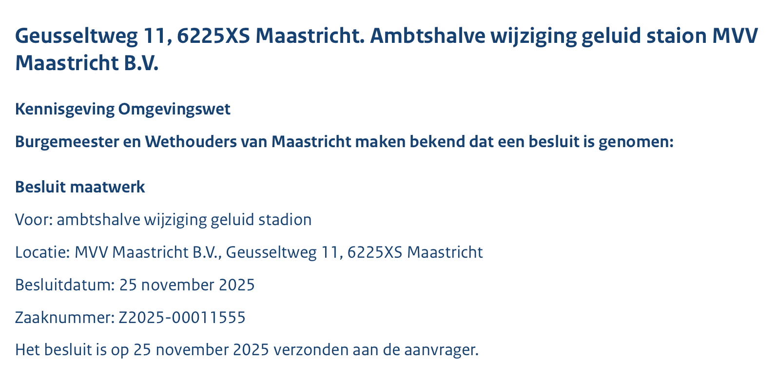 Hoe dat zo komt? Het stadsbestuur heeft MVV een "Ambtshalve wijziging geluid stadion MVV Maastricht B.V." gestuurd, zo blijkt uit door de gemeente gepubliceerde stukken. Van het stadhuis moet het geluidsvolume binnen het stadion dusdanig zijn, dat het op de gevels van drie nieuwe appartementencomplexen 'de Scheg' niet hoger is dan maximaal 59dB(A).
