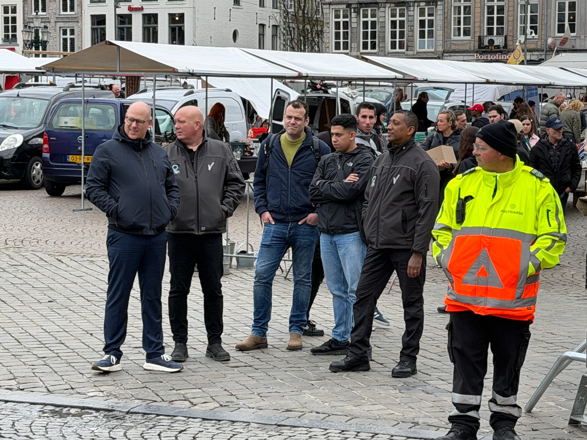 De vijf bewakers volgden de demonstranten, die bij ingangen van de parkeergarages demonstreerden en foldertjes uitdeelden, op de voet. Ze liepen helemaal mee met de demonstratie, die begon bij het station en ontbonden werd bij het Landbouwbelang. Behalve aanwezig te zijn hebben ze niets gedaan.