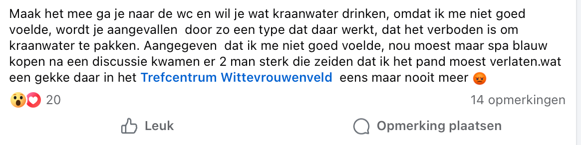Tijdens de dameszitting in het Trefcentrum Wittevrouwenveld is een ruzie ontstaan over water. Een bezoekster die gratis water pakte op de wc om te drinken, is om die reden buitengezet. Reden: het is verboden in het Trefcentrum om op de toiletten gratis water te pakken om te drinken. De ruzie is op Facebook totaal geëscaleerd. "Als je geen water kunt betalen, moet je in je brak blijven!"