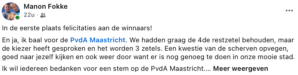 Een gevalletje framing was er ook bij Manon Fokke. Hoe kun je het verlies zo klein als mogelijk voorstellen? Juist: door dat verlies te bagatelliseren. De PvdA had graag de vierde restzetel behouden. Lees: Dat restje ligt nu in de roeij tuut vaan Sjonnie en we hebben nog steeds die drie echte volwaardige zetels. Dus het valt wel mee. Dat is de slim verpakte boodschap. Een spindoctor waardig. Maar de waarheid anders opgeschreven luidt zo: de kiezer heeft gesproken en het worden twee zetels. We hebben een derde restzetel gekregen.