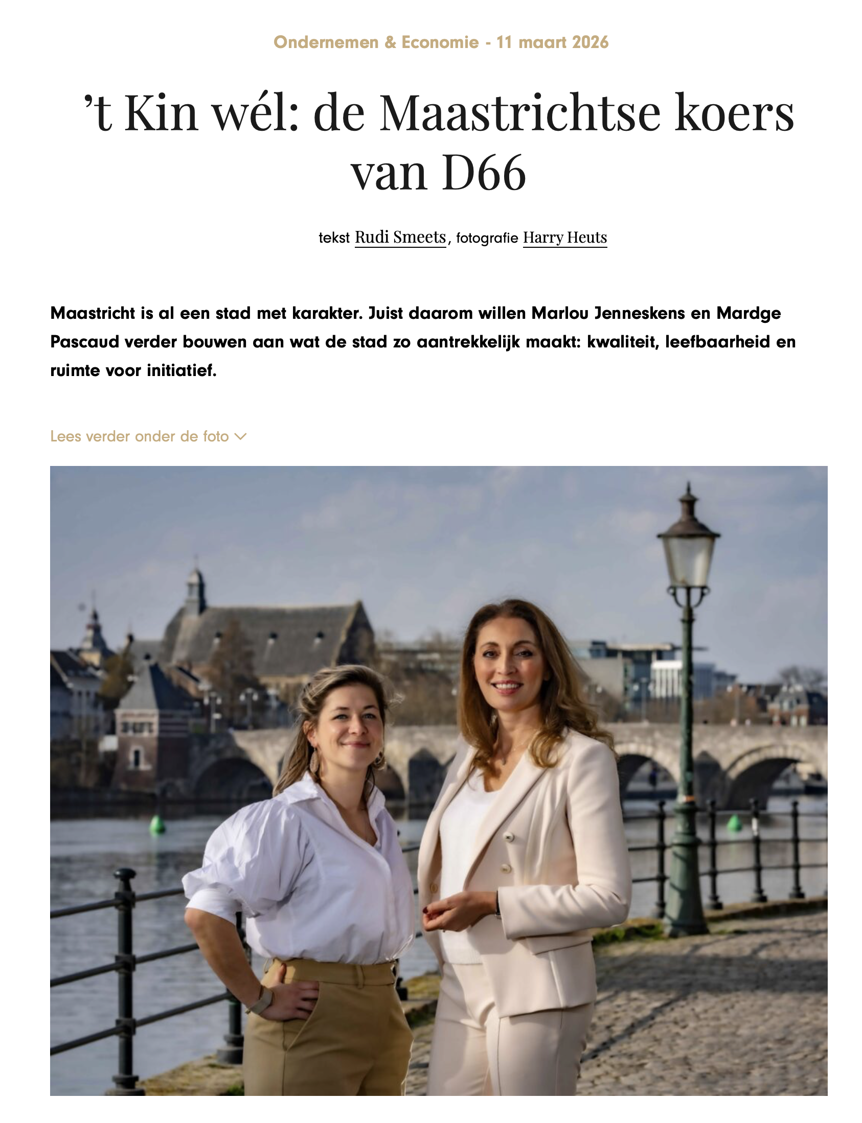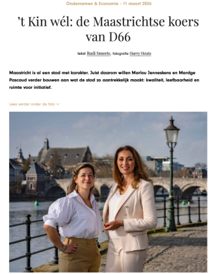 D66 moet gedacht hebben: dat gebeurt ons niet. Waar halen we die laatste veertig stemmen om ook de derde, vierde of misschien wel vijfde zetel veilig te stellen? De 'Meidskes vaan Mestreech' kozen er heel slim voor om zich te profileren waar niemand anders dat doet. Bij Chapeau Magazine, online. Met de uitstraling van twee powervrouwen, mooi op de foto gezet door Harry Heuts die al heel wat artiesten voor zijn lens heeft gehad. Wat dan wel weer jammer is dat we Rob Jetten nu op de billboards van D66 in Maastricht zien. Dan weten we straks nog niet of het resultaat te danken is aan de premier-bonus die lokaal ingezet wordt, of dat D66 het lokaal ook op eigen kracht kan/kin/can. Ook al Sjoen.