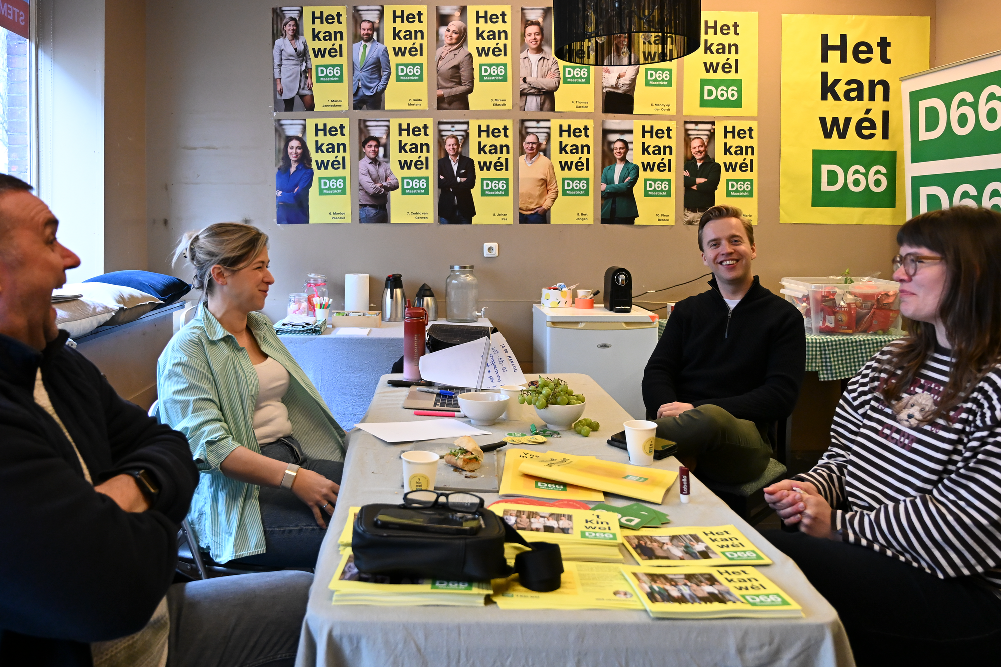 We blijven nog even bij D66. Onze fotograaf Joudy Kayali hadden we de stad ingestuurd voor een vrije reportage over het verkiezingsbeeld in de stad. Als je met deze foto terugkomt, dan heb je heel veel talent. Beeld van de politieke pop-up store van D66 in het voormalige winkeltje waar 't Rommedoeke zat. En duidelijk is dat Jo Smeets van Maastricht van NU, gastvrouw en gastheer Marlou Jenneskens en Thomas Gardien en Gabriëlle Heine van het CDA veel lol hebben. Ze vechten elkaar heus niet alleen maar de tent uit in de Maastrichtse politiek. Zelfs Johan Pas kijkt toe. De druiven zijn niet altijd zuur. Sjoen.