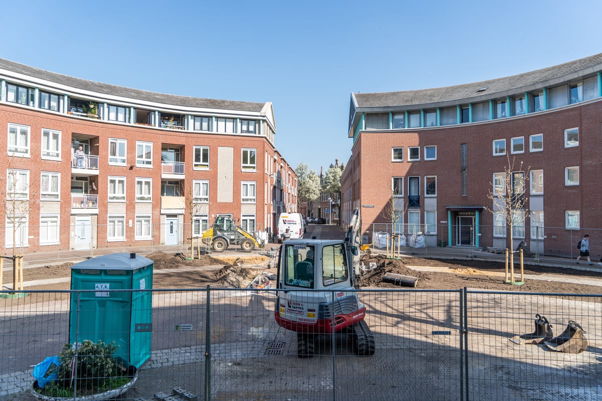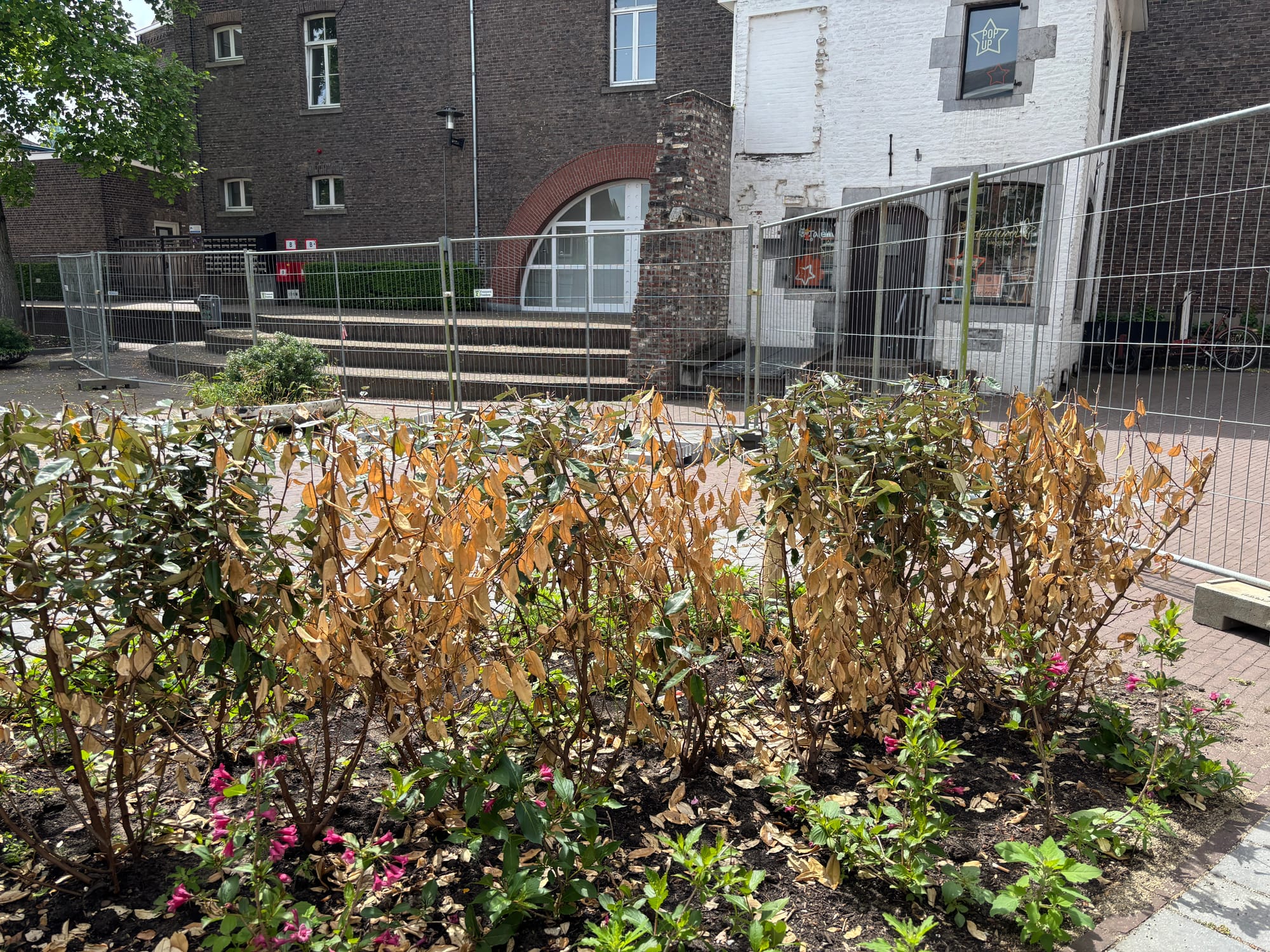 Op het Misericordeplein werd het groen enthousiast aangeplant, waarna een periode van droogte volgde. Het groen kleurde links en rechts geel. Planten verdorden. De verdroging stopte onlangs omdat er weer wat meer regen viel. De hekken om het plein staan er nog steeds. Waarom? Wie het weet mag het zeggen. De betonnen bloembakken zaten duidelijk niet in de aanbesteding van het groen.