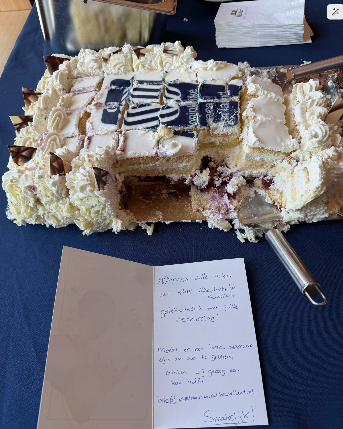 Kijkt u eens naar bovenstaande foto. Wat valt op? Precies. De taart was voor de nieuwe gemeenteraadsleden. Een felicitatie van de leden van KHN Maastricht-Heuvelland. KHN staat voor Koninklijke Horeca Nederland, met andere woorden mensen die verstand hebben hoe je een stuk taart, vlaai of gebak presenteert of hoe je een taart aansnijdt. Het lijkt wel of hier de bulldozer door heen is gegaan en dan ook nog op een kartonnen 'bordje' presenteren. Terug naar de hotelschool zouden we zeggen.