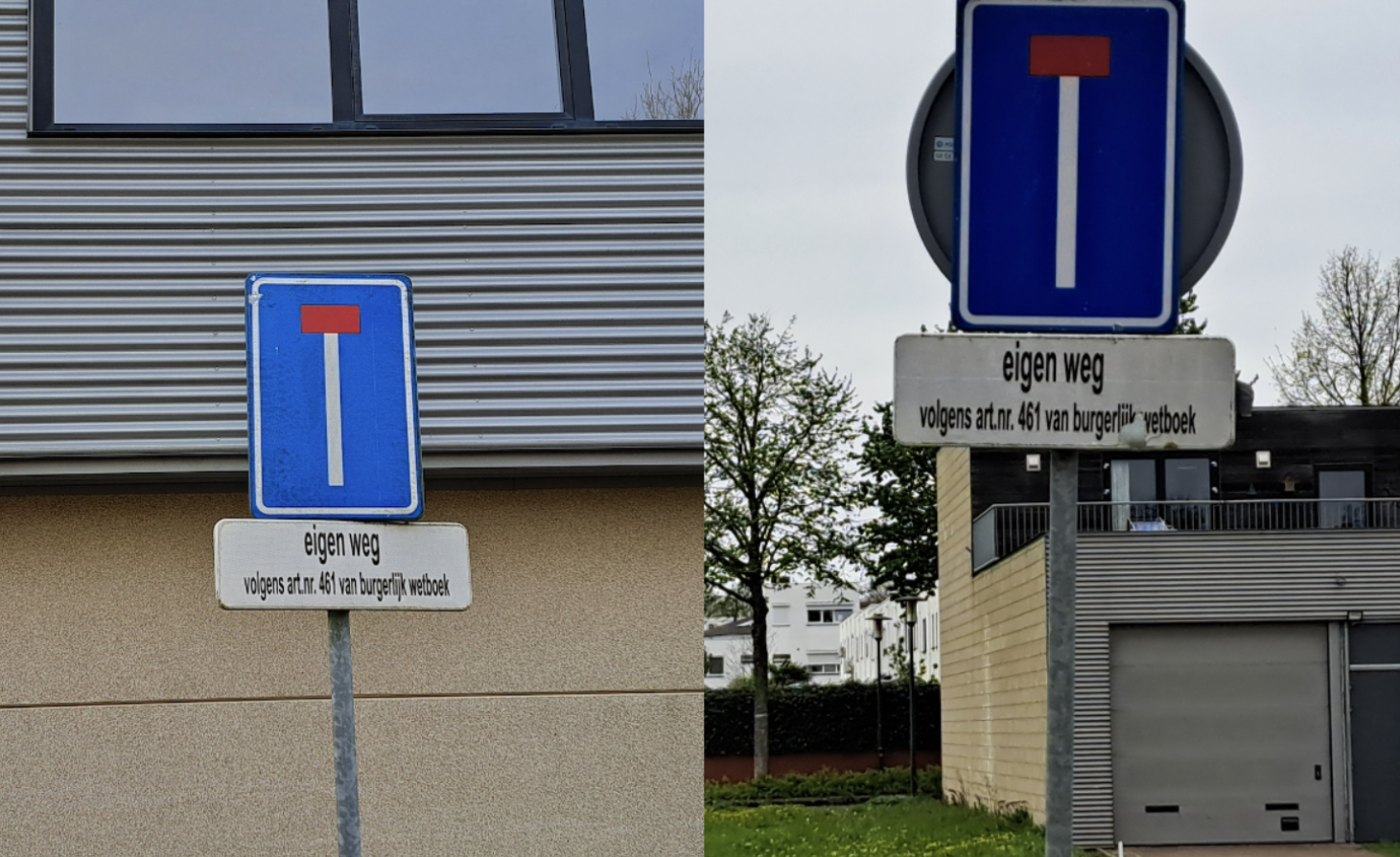 Het wordt nog hilarischer op de onderborden. "Eigen weg volgens art. nr. 461 van burgerlijk wetboek". De gemeente Maastricht stelt dat het hier inderdaad een "eigen weg" betreft en dus geen openbare weg is volgens artikel 4 van de Wegenwet. Dat is een zeer discutabele overweging. De betreffende ventweg is namelijk al twee decennia gewoon toegankelijk voor alles en iedereen, te meer omdat artikel 461 van het burgerlijk wetboek helemaal niet gaat over wel/geen toegang hebben tot wat dan ook. Nog los van het feit dat het burgerlijk wetboek bestaat uit tien afzonderlijke boeken en dus sowieso onduidelijk is welk artikel 461 uit welk burgerlijk wetboek hier bedoeld wordt. De ontwerper van dit onderbord heeft gewoon een fout gemaakt en bedoelde waarschijnlijk gewoon artikel 461 van het Wetboek van Strafrecht. Maar ja, dat staat er niet.