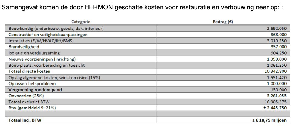 Aan de advisering is ook opmerkelijk dat Hermon Hermitage bij de kosten voor de meest uitgebreide renovatie van de Bonbonnière rekening houdt met 19 miljoen euro. Dat gaat onder meer op aan cascoherstel, installaties, theatertechniek, publieksvoorzieningen, horeca, projectorganisatie en 25% onvoorziene kosten.