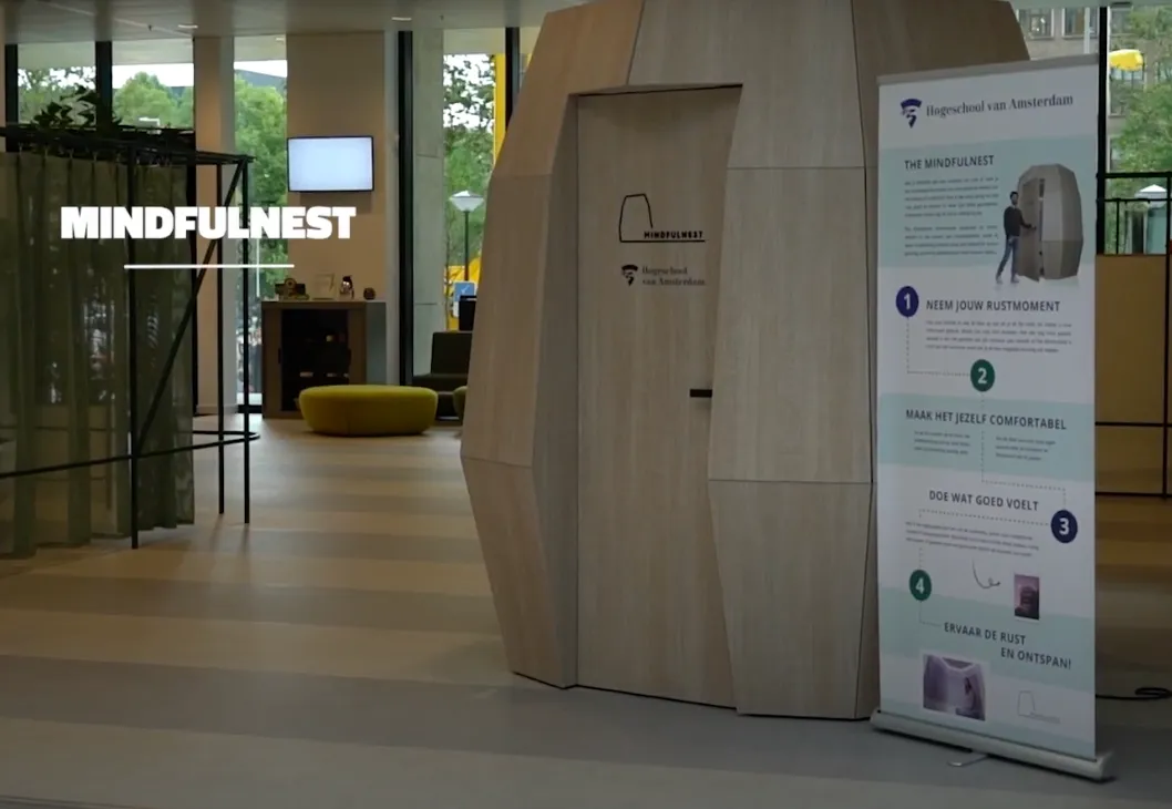 Studenten van de Universiteit Maastricht hebben seks in het zogenoemde mindfulnest. Het mindfulnest is een dichte en nagenoeg geluiddichte cabine (zie foto), bedoeld als ontspanningsruimte waarin de studenten tot rust kunnen komen.